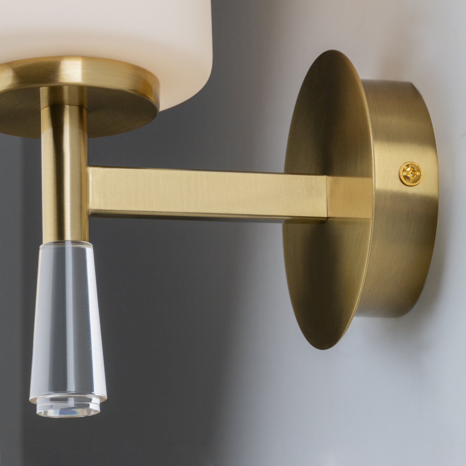 Арматура металл. Цвет латунь. Стеклянные белые плафоны хорошо рассеивают свет, направлены вверх, тем самым вытягивают потолок. Декоративные элементы в виде хрустального основания и капель из акрила. Источник света — лампа. Цоколь E27.