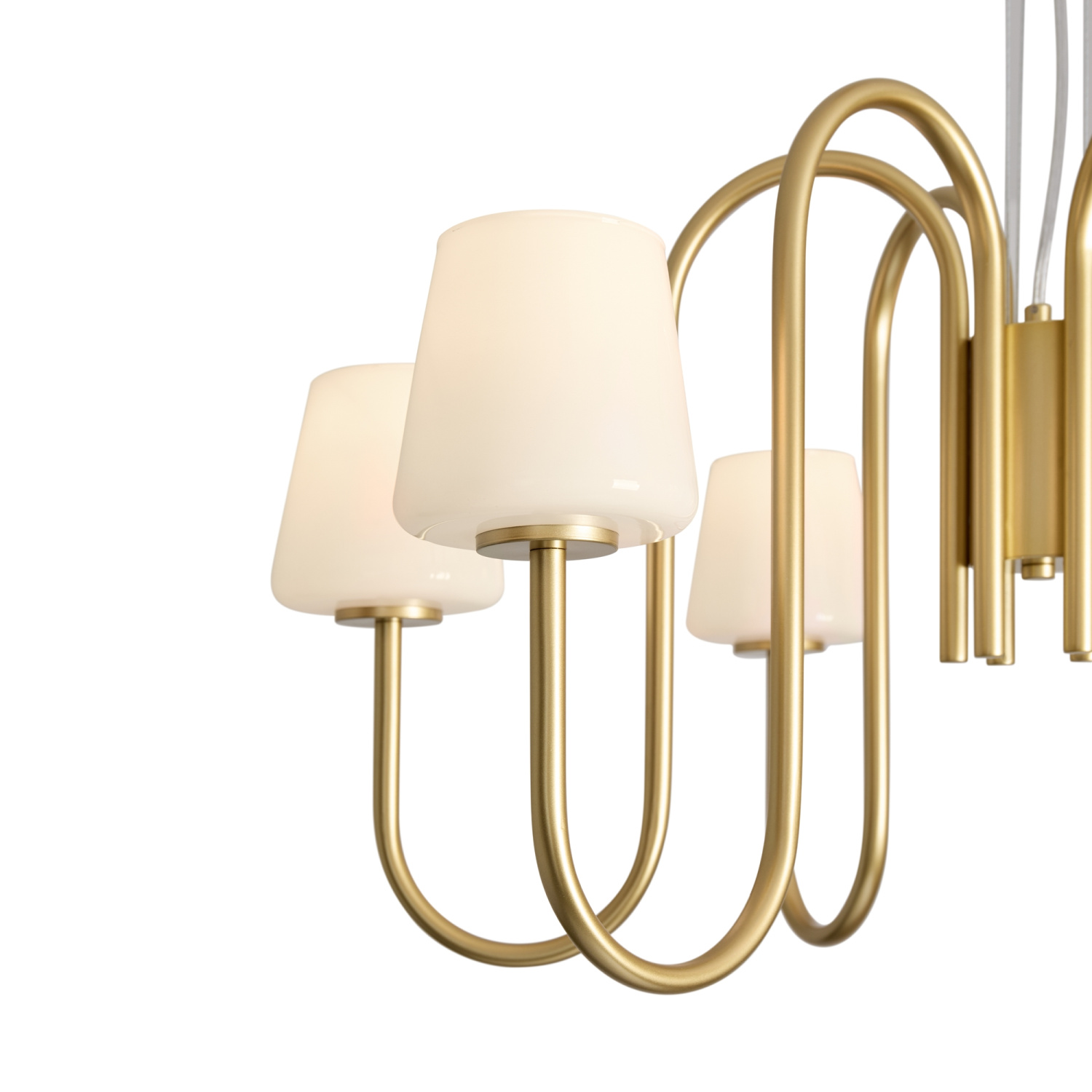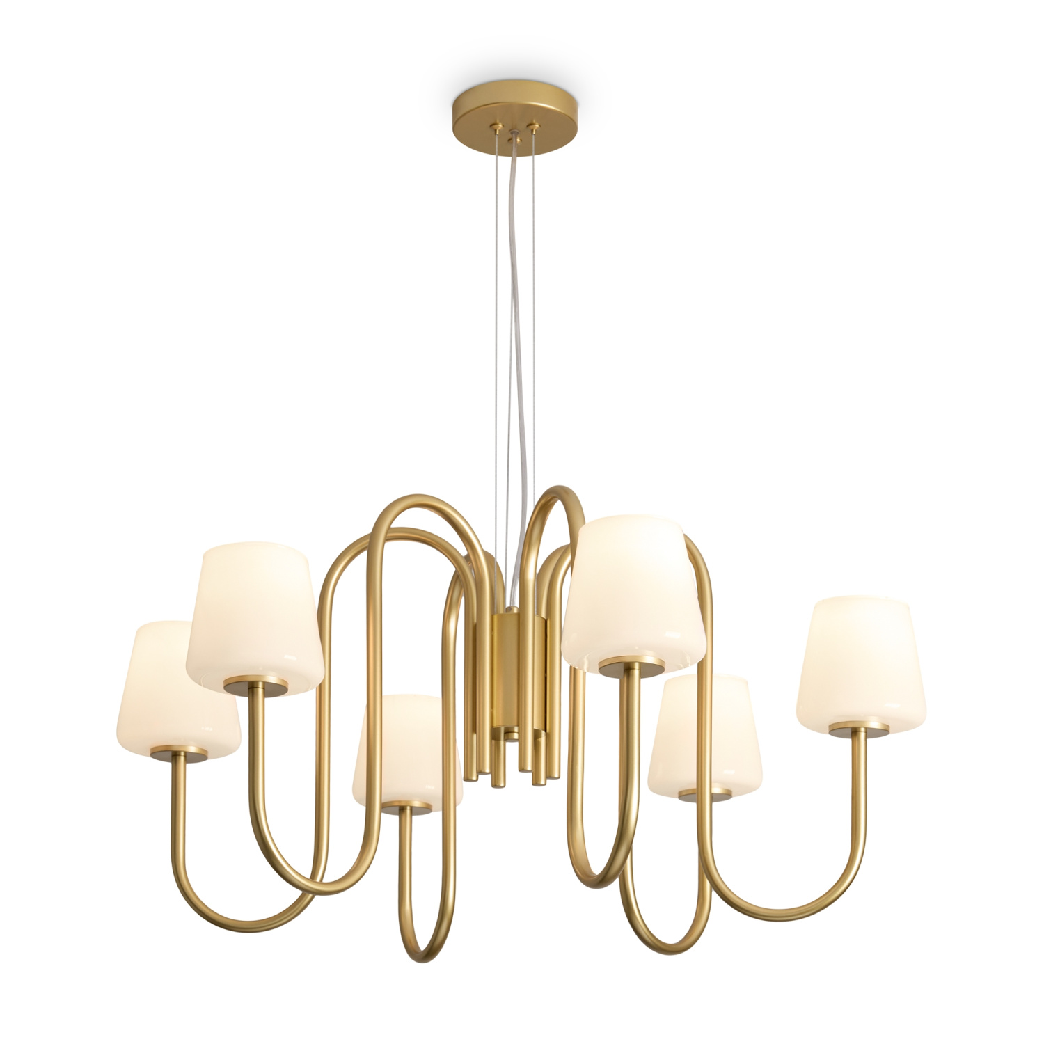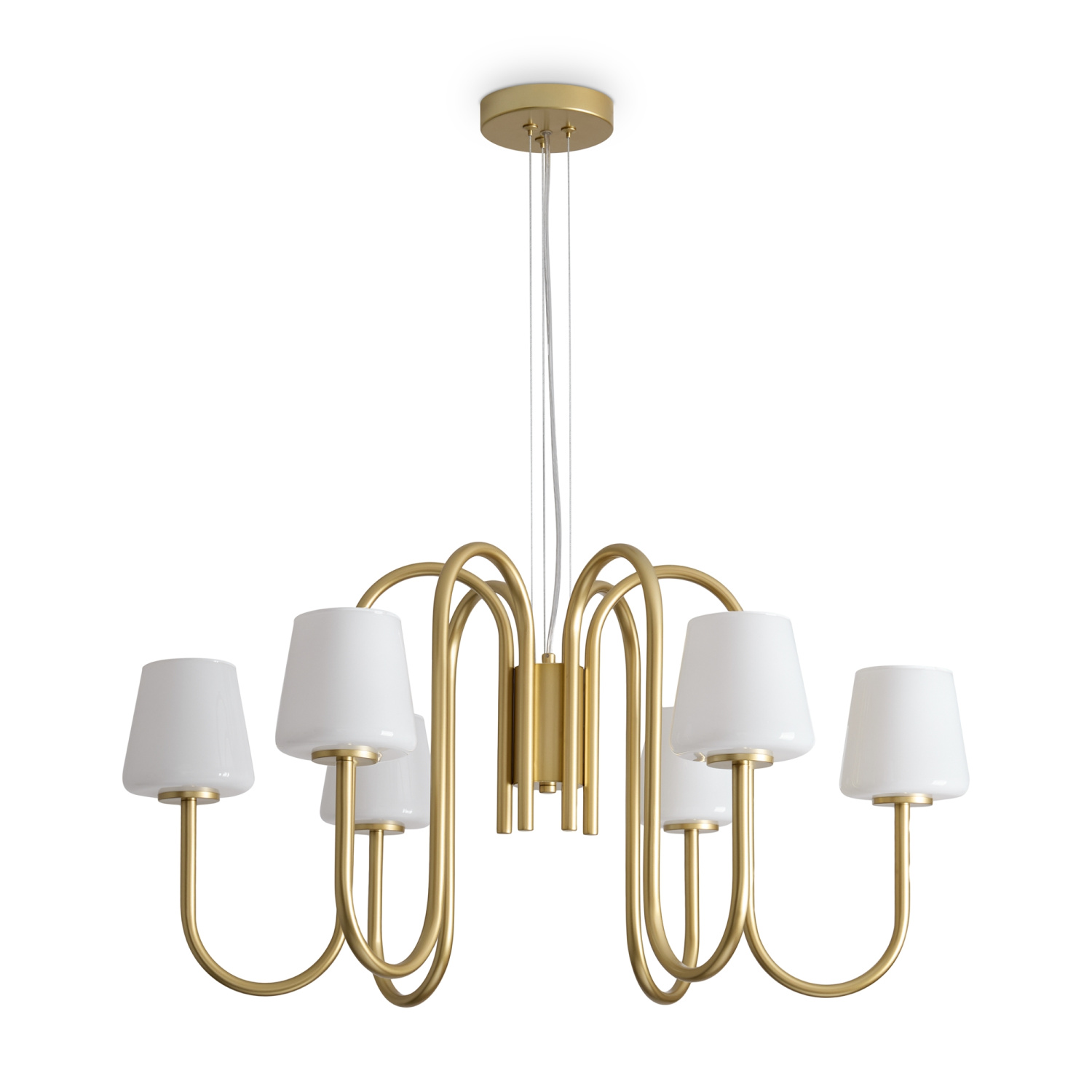 Материал арматуры — металл, цвет — матовое золото. Подвесной и настенный светильники с цоколем E14. Плафоны выполнены из белого глянцевого стекла, которые мягко рассеивают свет. Минималистичная классика подходит для современных и традиционных интерьеров.