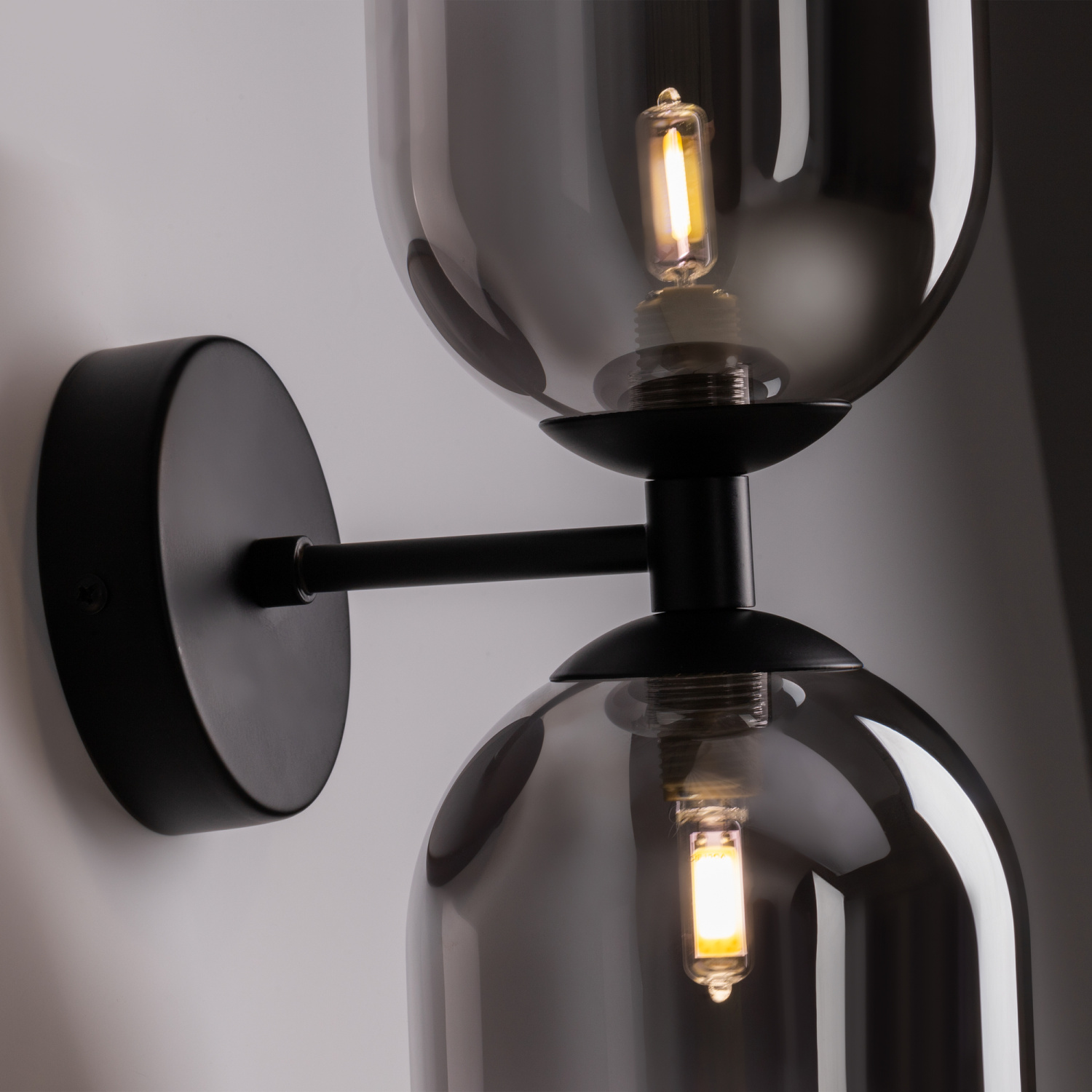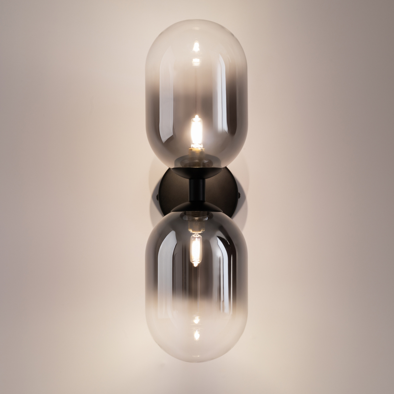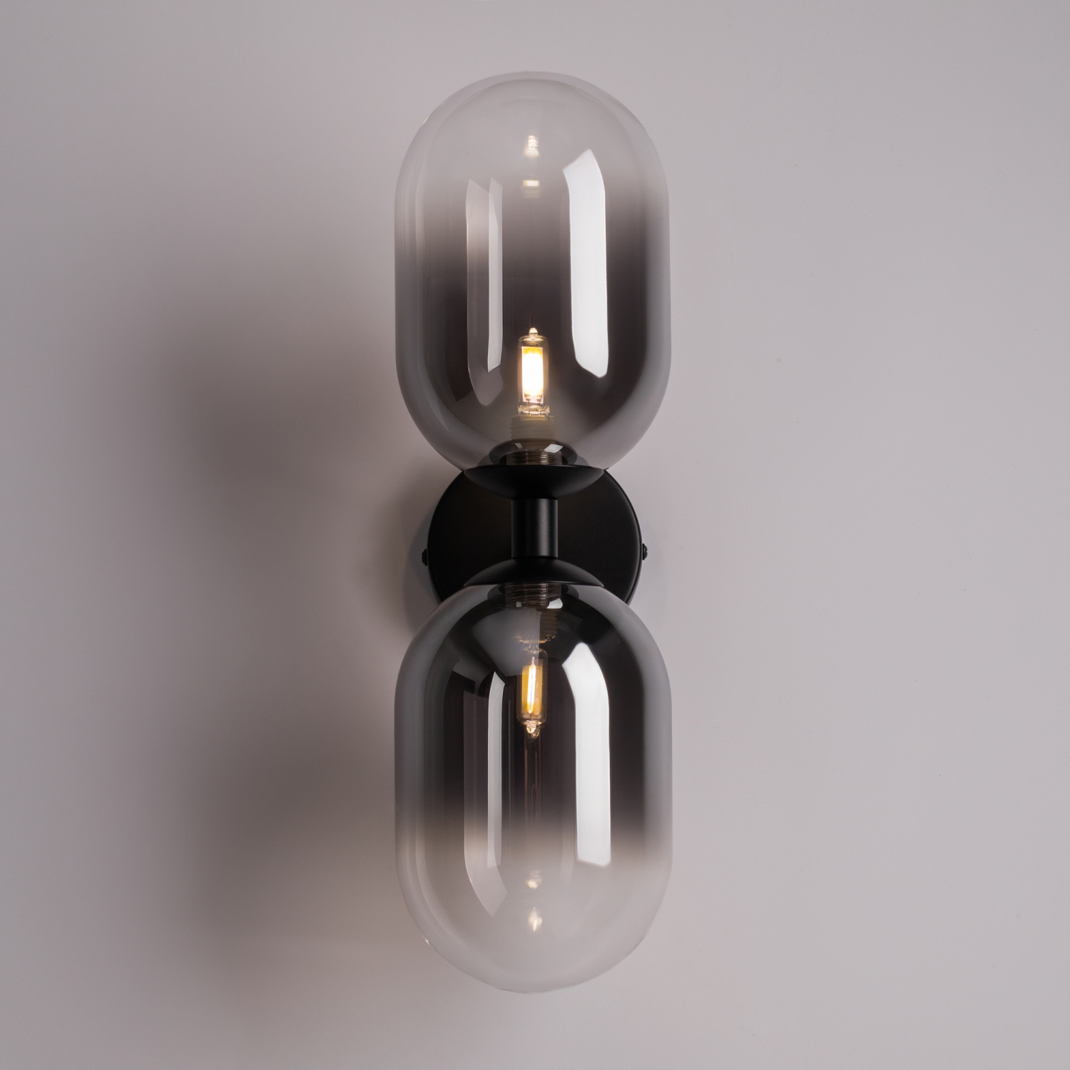 Арматура из металла матового черного цвета. Плафон из стекла с окрасом растяжка. Цвет дымчатый. Модификация — настенные, потолочные и настольные светильники. Источник света — лампа. Цоколь G9.