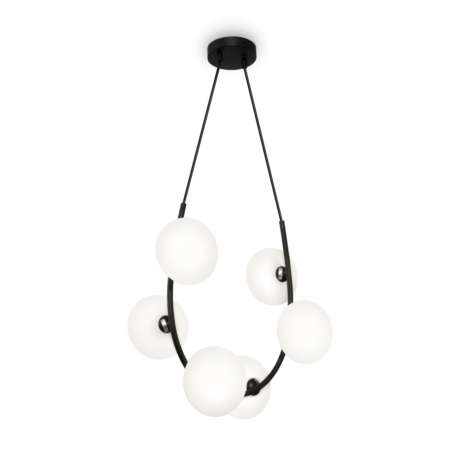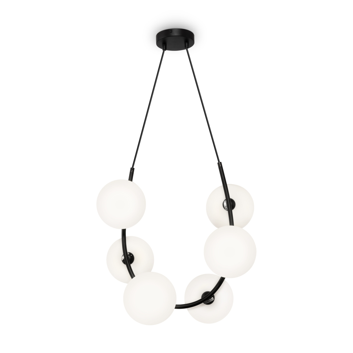Металлическая арматура в черном цвете. Плафоны формы шар из матового белого стекла. Оригинальный силуэт арматуры с «нанизанными» плафонами. Удлиненный кабель для помещений с высокими потолками. Источник света – лампа G9.