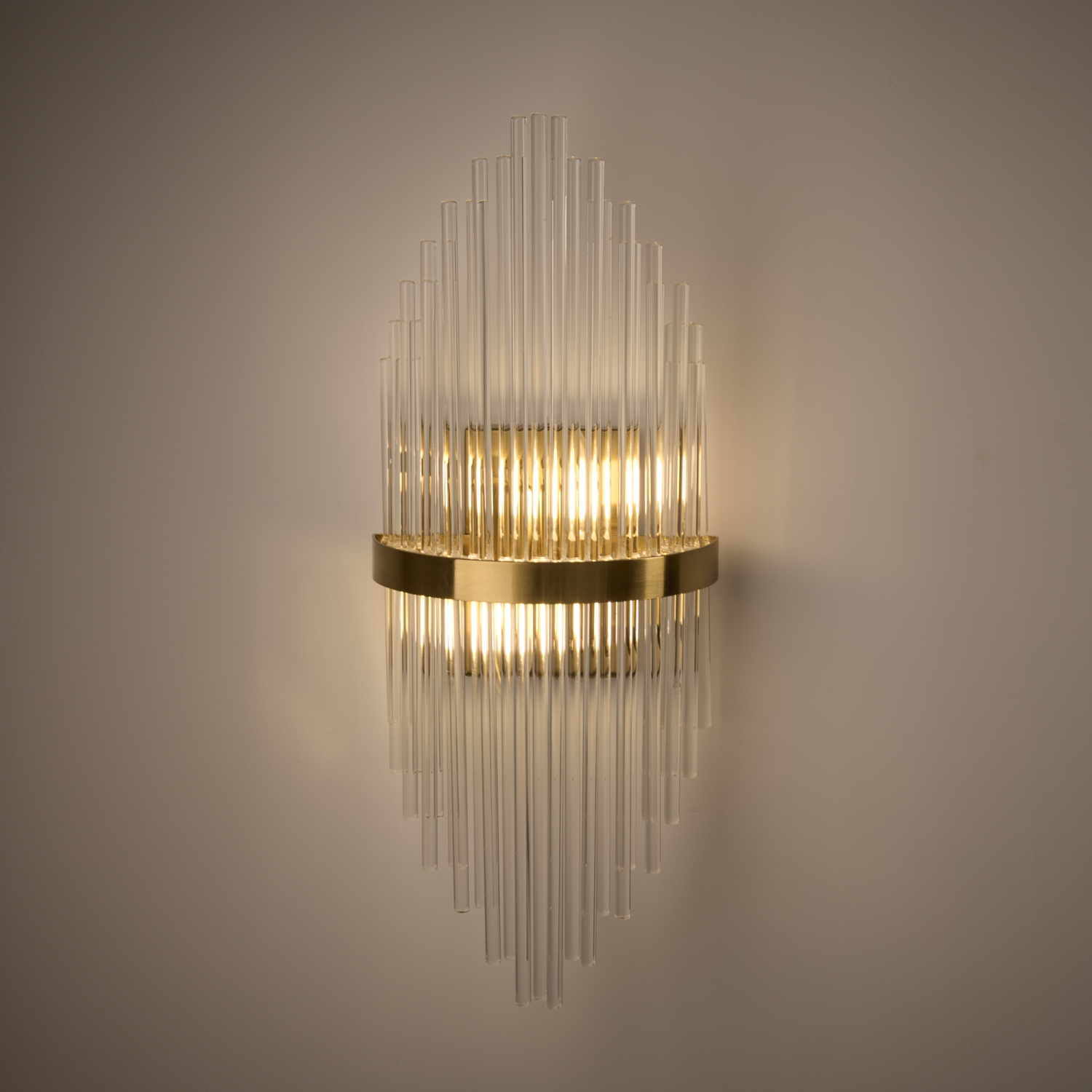 Металлическая арматура, цвет - латунь. Декоративные элементы - прозрачные стеклянные трубки, обрамленные в металлической кольцо в тон арматуре. Источник света - лампа с цоколем Е14.