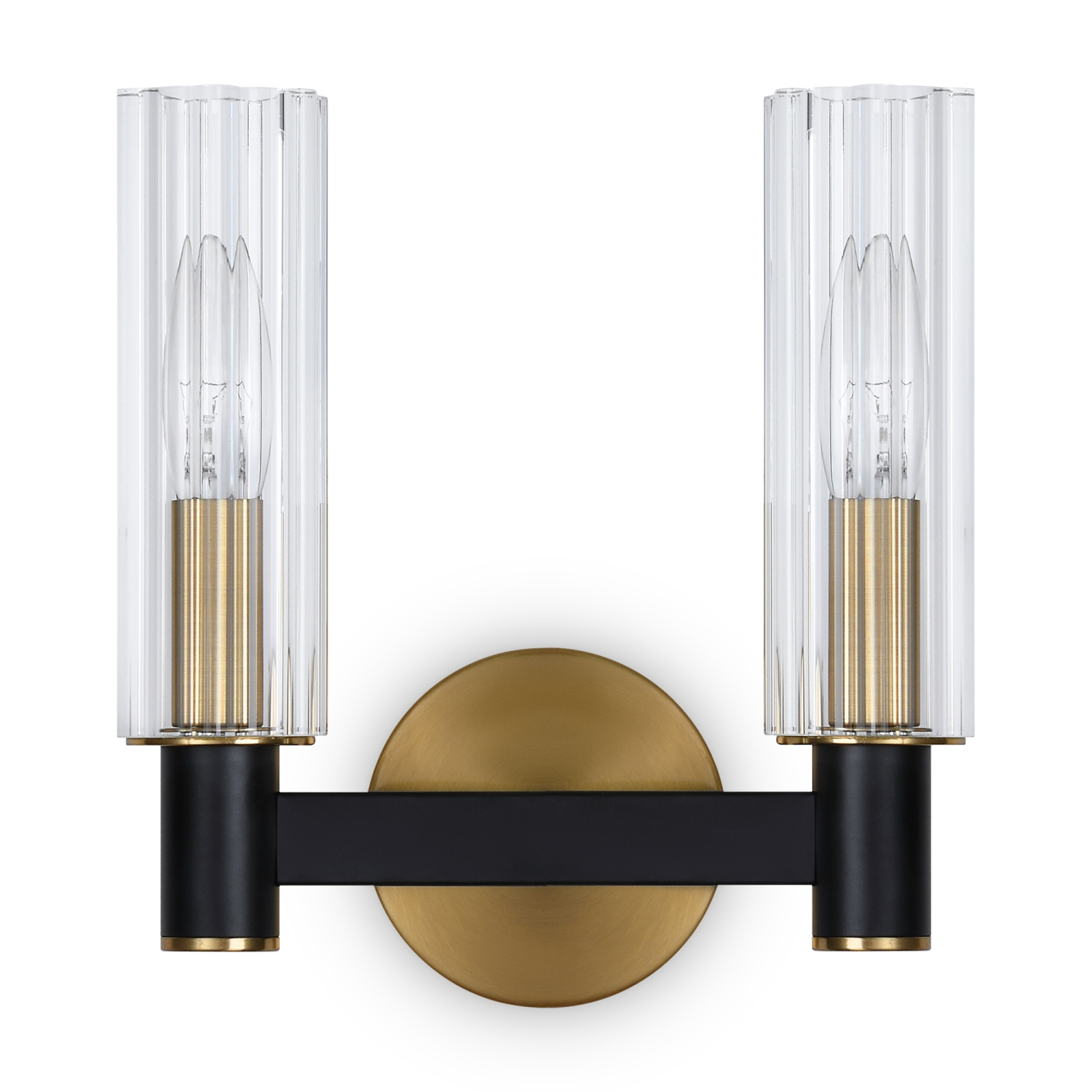 Арматура из металла сочетает два оттенка: черный и латунь. Плафоны цилиндрической формы выполнены из рельефного прозрачного стекла. Актуальная геометрия с настроением американской классики. Источник света – лампа с цоколем E14.