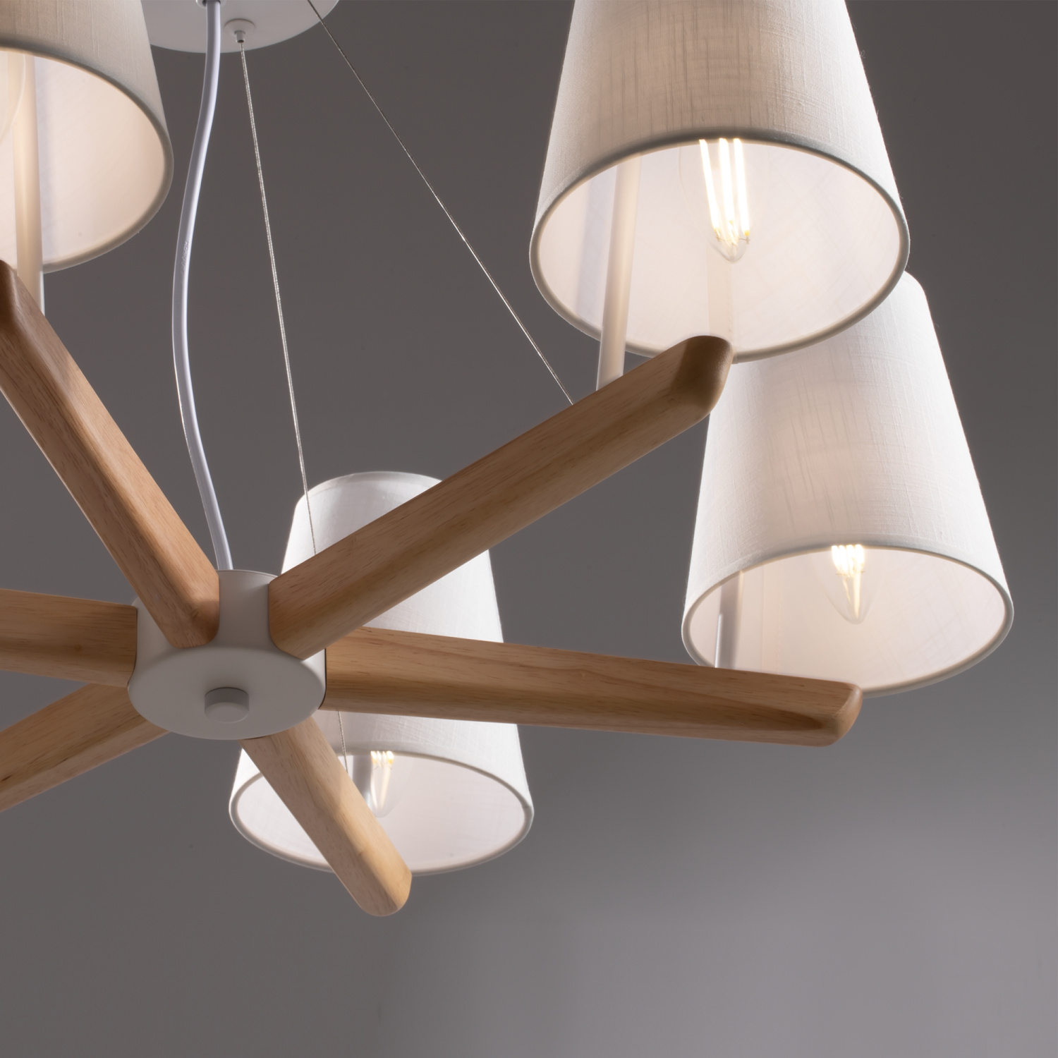 Материал арматуры – металл, цвет – белый. Абажуры из текстиля белого оттенка. Декоративные элементы из натурального дерева. Трендовый экодизайн. Источник света – лампа с цоколем E14.