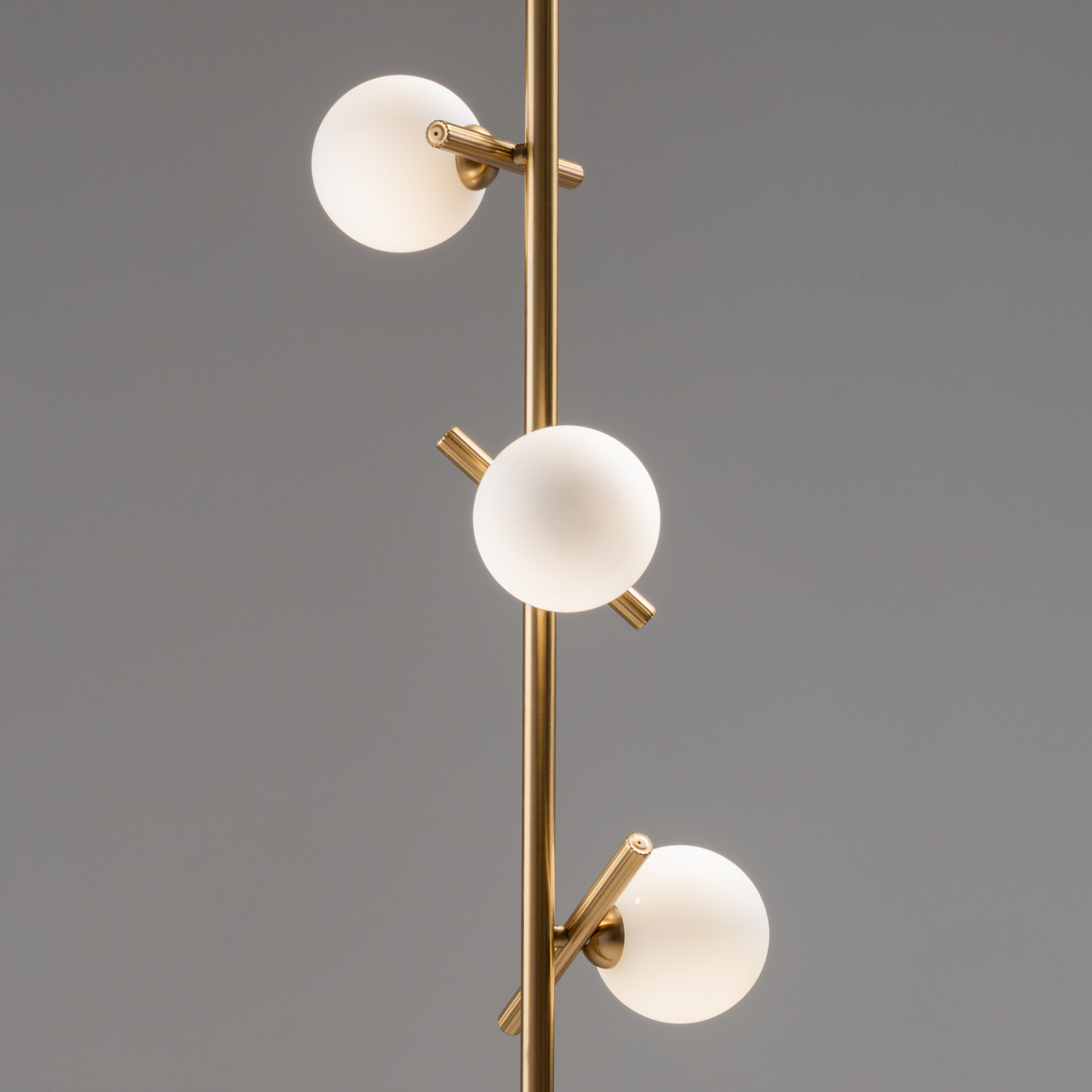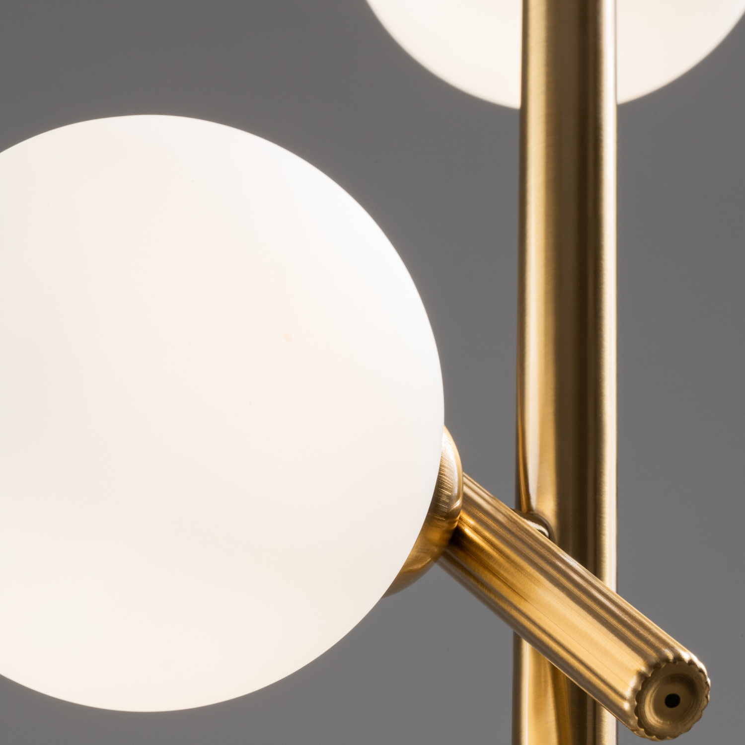 Материал арматуры — рифленый металл, цвет — латунь. Плафоны-сферы из белого матового стекла для мягкого заливающего света. Воздушный образ плафонов, строгие тонкие линии арматуры придадут интерьеру изящество и легкость. Высота подвесов регулируется. Источник света — лампы с цоколем G9.