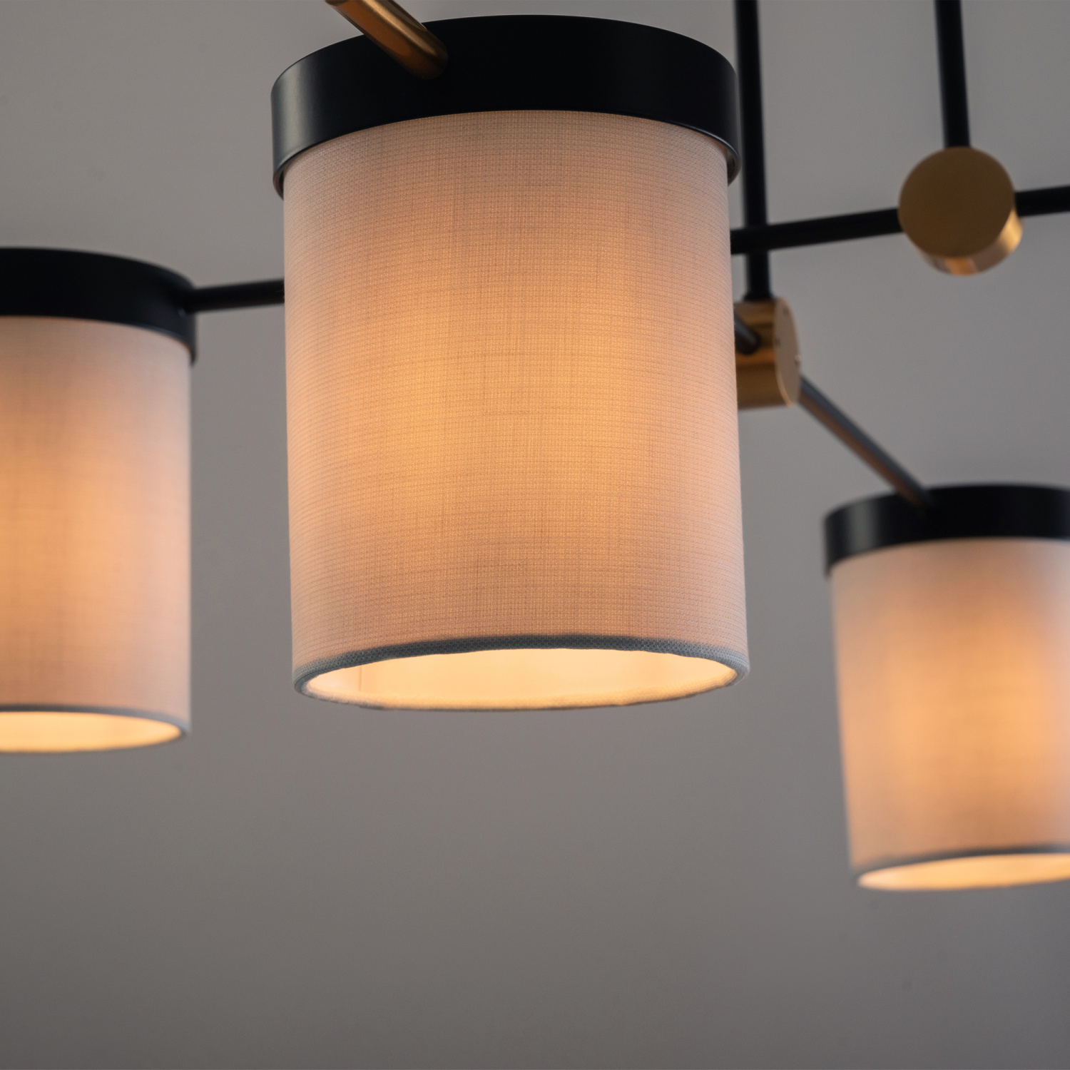 Арматура из металла. Основной цвет — чёрный, декоративные элементы в цвете латунь. Тканевые бежевые абажуры-цилиндры украшены чёрными металлическими основаниями. Компактные размеры для невысоких потолков. Источник света — лампа с цоколем Е14.