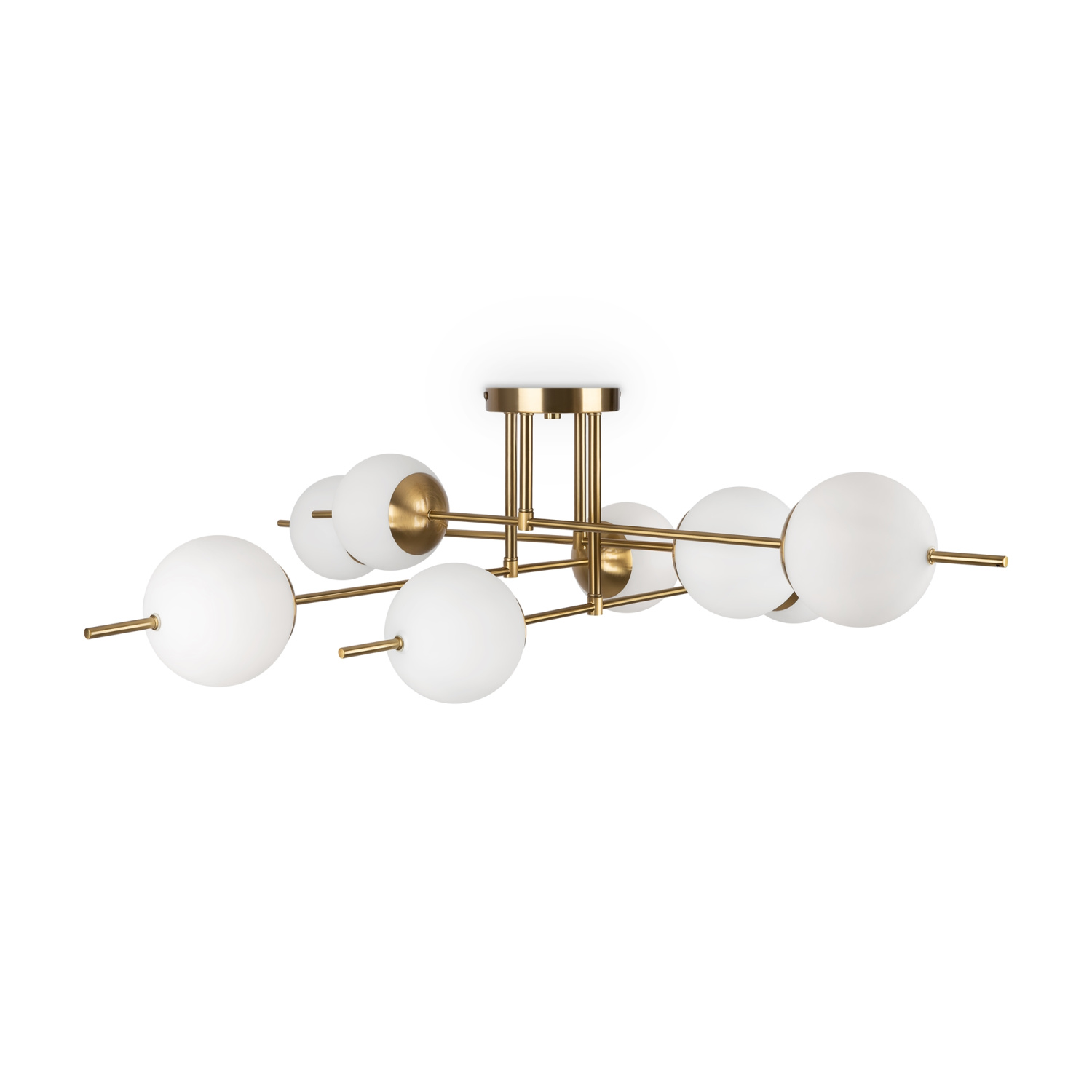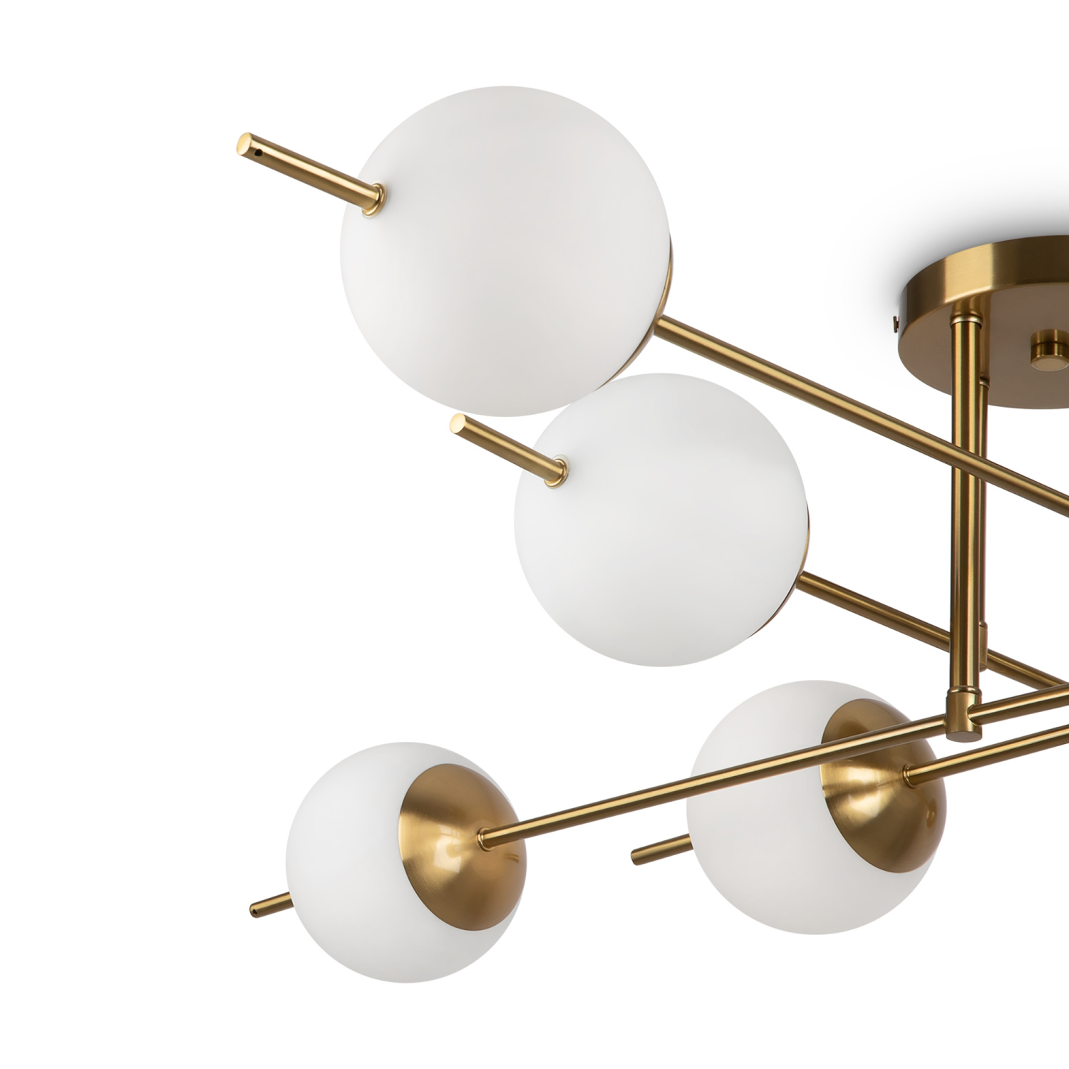 Арматура из металла. Цвет – латунь. Плафоны – матовое белое стекло. Трендовая геометрия в дизайне: арматура «пронизывает» плафоны-сферы. Источник света – лампа с цоколем Е27.