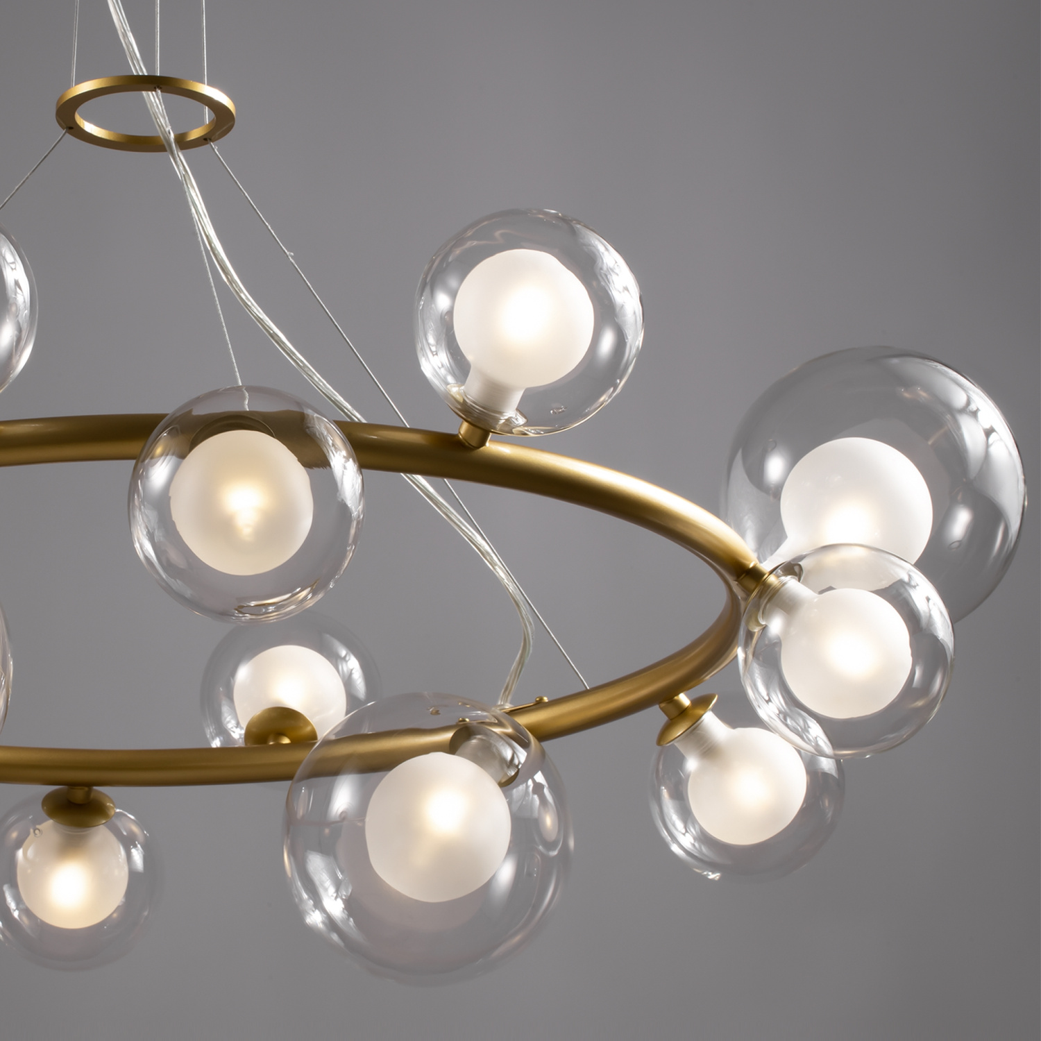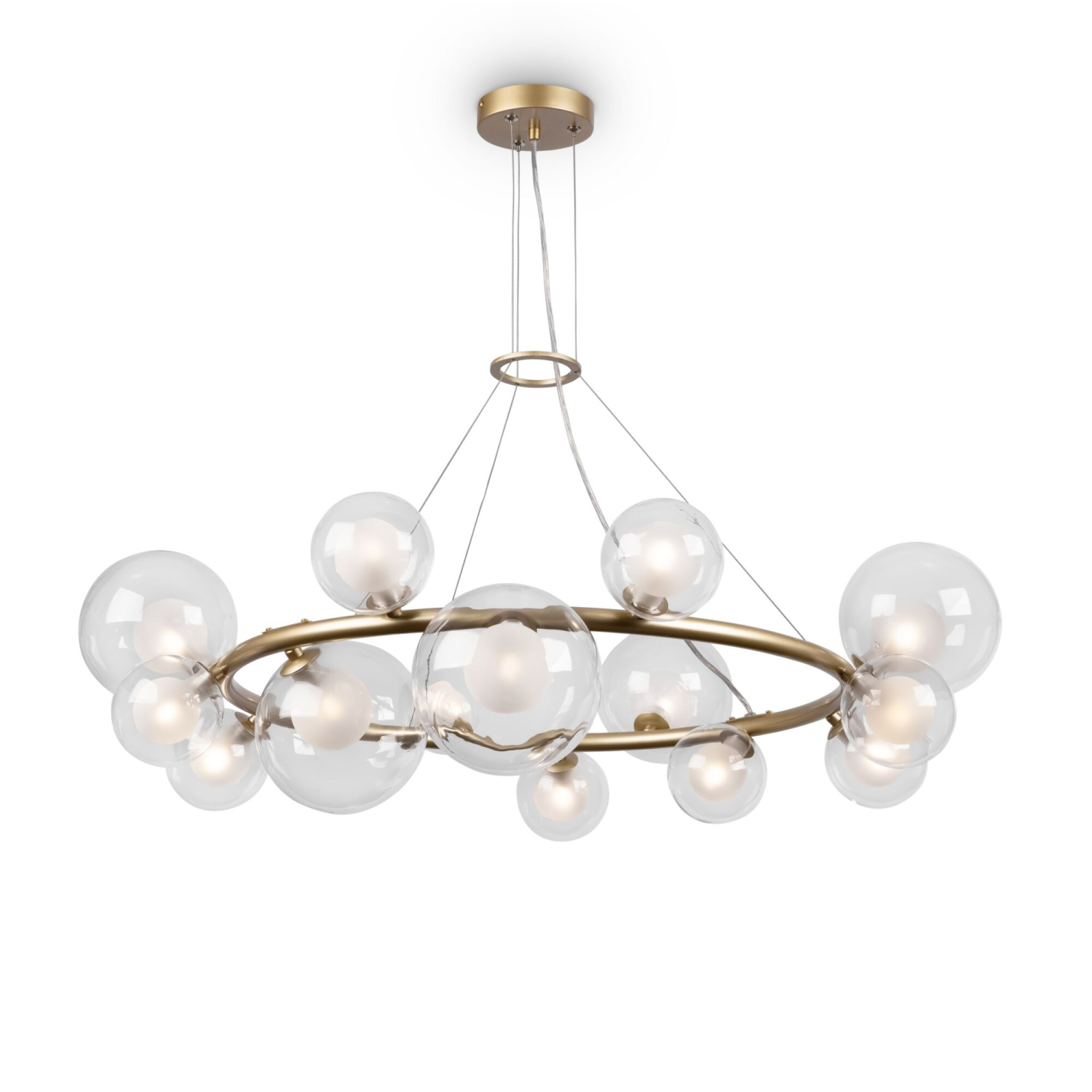 Металлическая арматура оттенка матового золота. Двойные стеклянные плафоны: матовые внутри и прозрачные снаружи. Плафоны закреплены на окружности, что обеспечивает равномерное освещение. Источник света – лампа с цоколем G9.