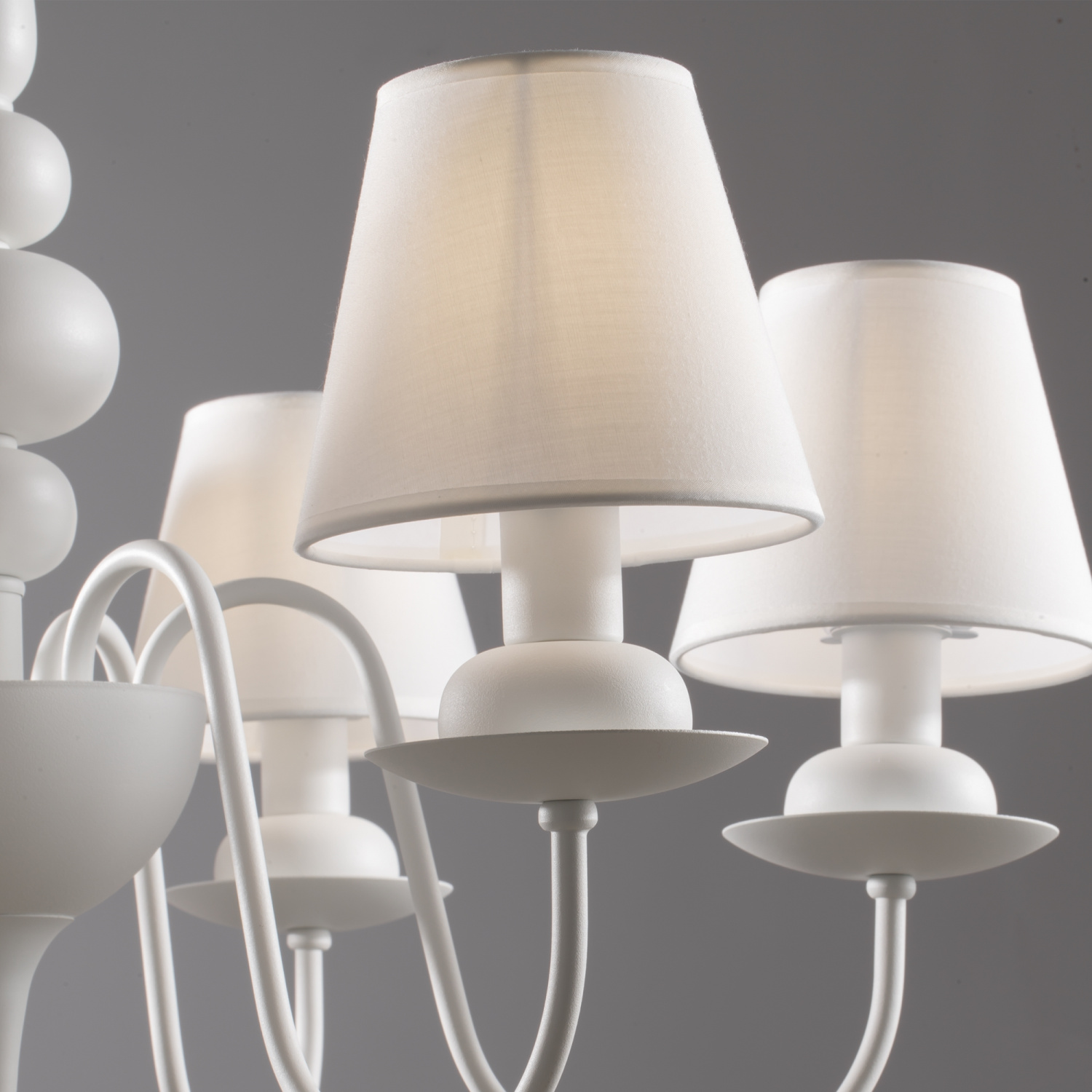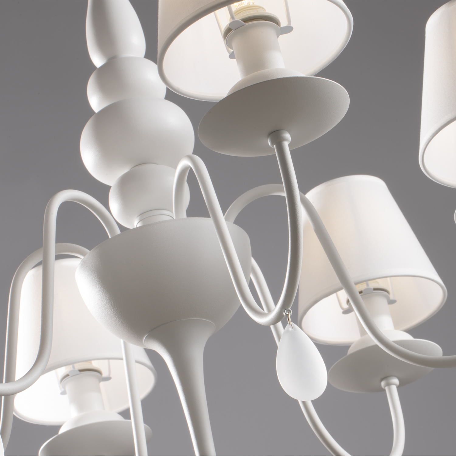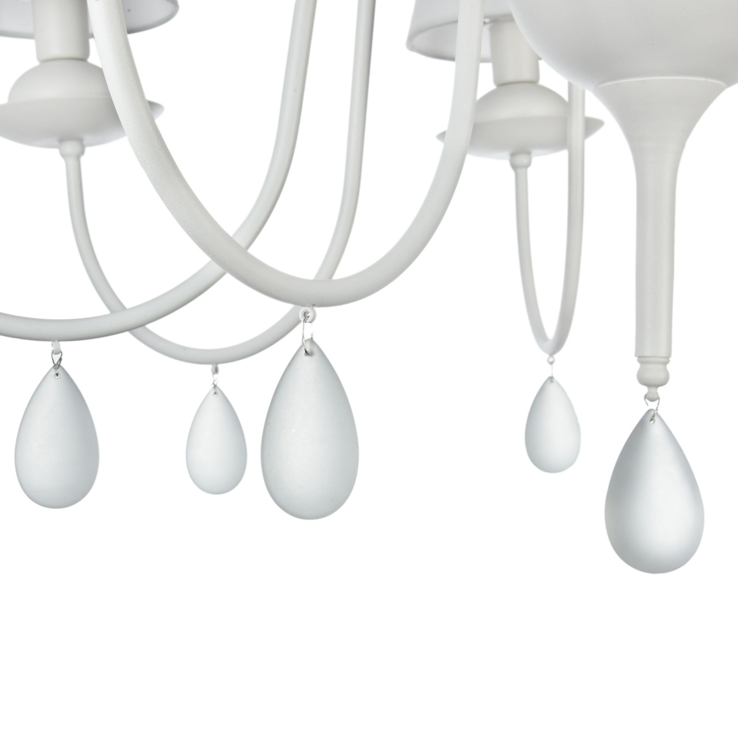 Дизайн светильников – это дуэт вечной классики и высоких технологий. Арматура и абажуры выполнены в приятном для глаз теплом белом цвете. Абажуры сделаны из ПВХ и ткани, а арматура - из стекла и металла. Светильники украшены декоративными стеклянными подвесками в виде капель.