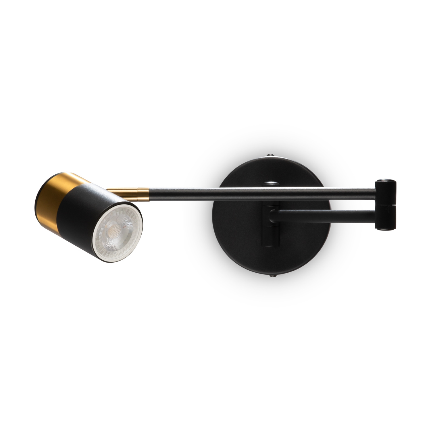 Арматура и плафоны из металла. Черный цвет дополнен латунной окантовкой. Поворотные плафоны и арматура позволяют видоизменять композицию и регулировать направление светового потока. Источник света – лампа GU10.