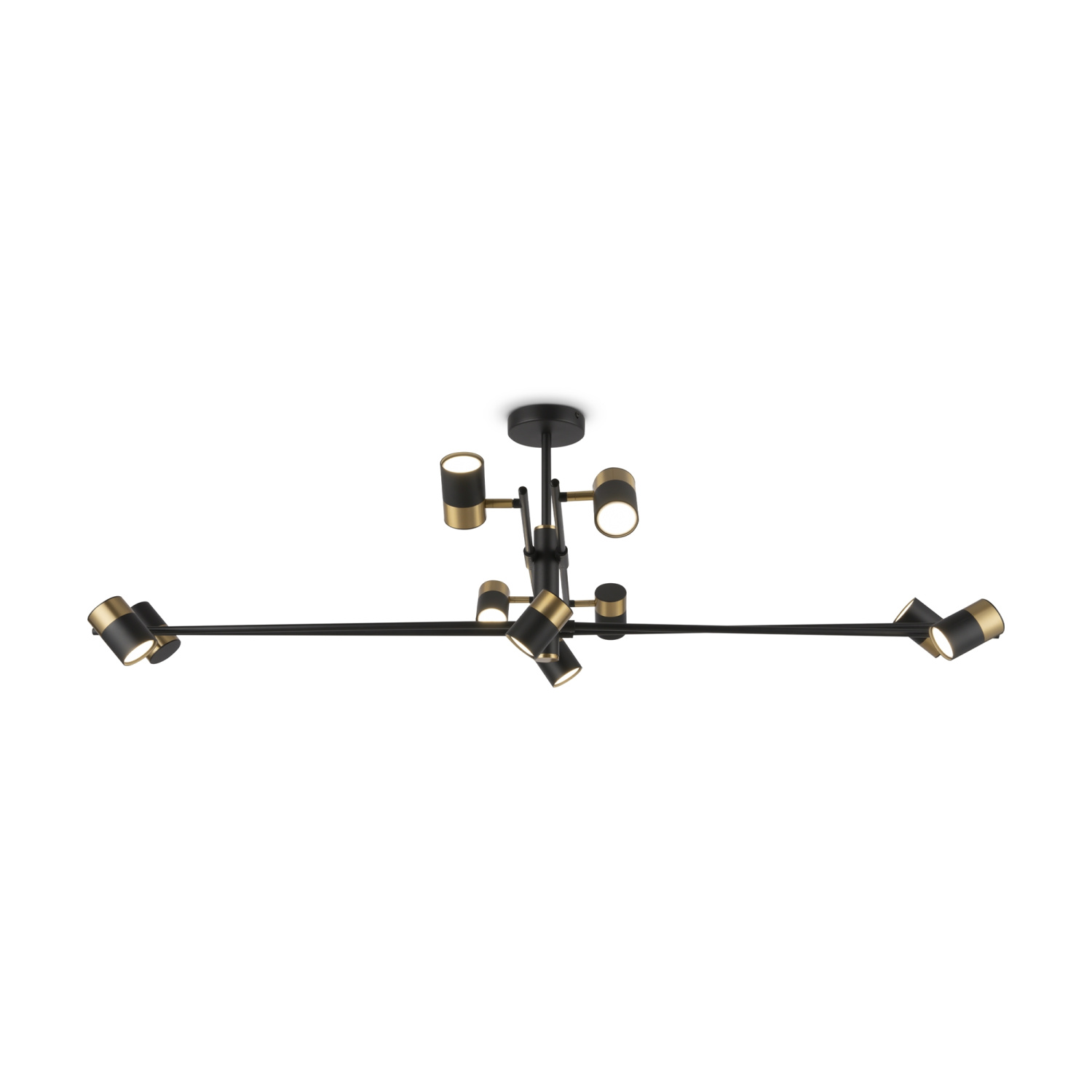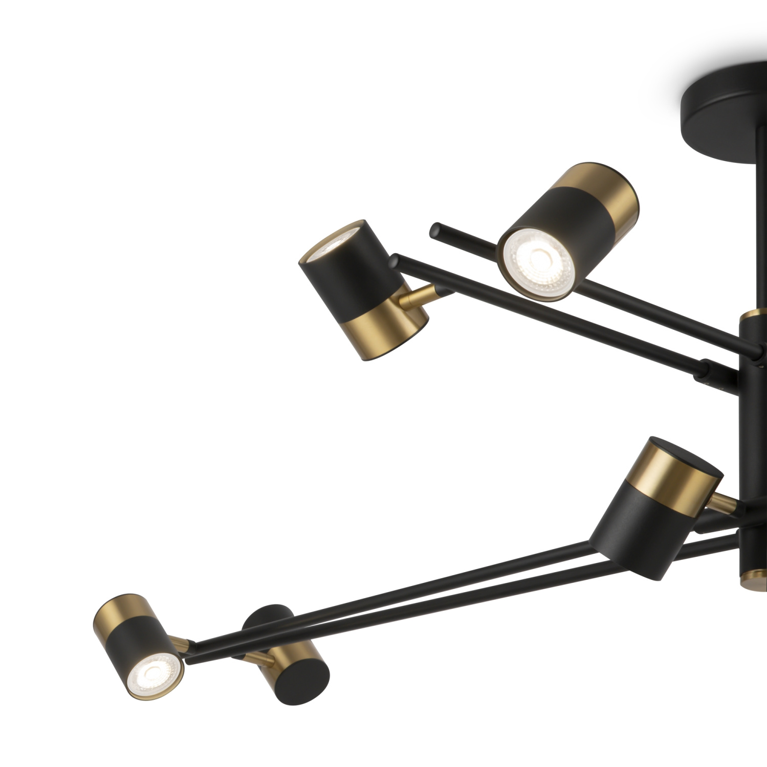 Арматура и плафоны из металла. Черный цвет дополнен латунной окантовкой. Поворотные плафоны и арматура позволяют видоизменять композицию и регулировать направление светового потока. Источник света – лампа GU10.