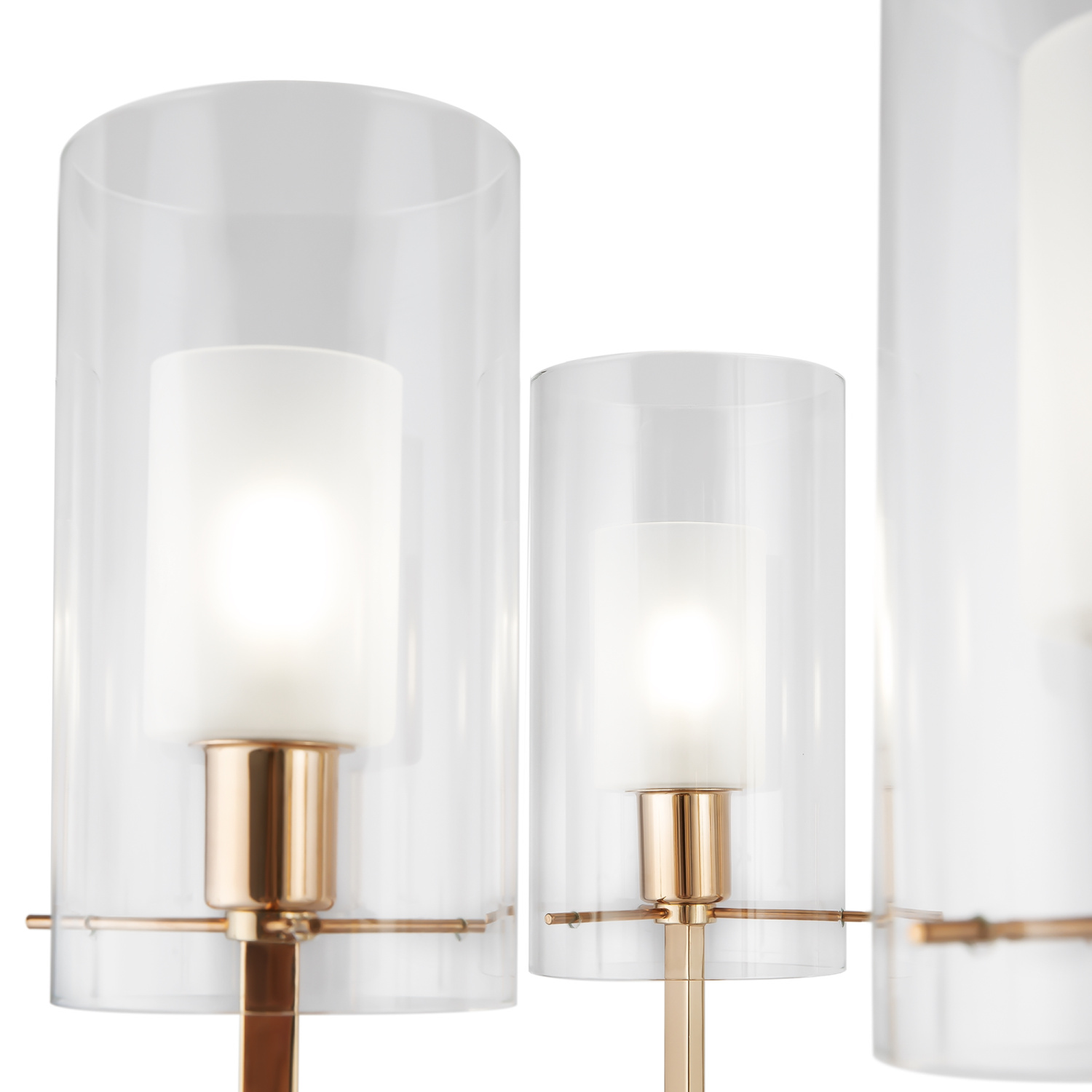 Металлическая арматура оттенка французского золота. Двойные стеклянные плафоны: матовые внутри, прозрачные снаружи. Лаконичная геометрия с симметричным расположением элементов. Источник света – лампа с цоколем E14.