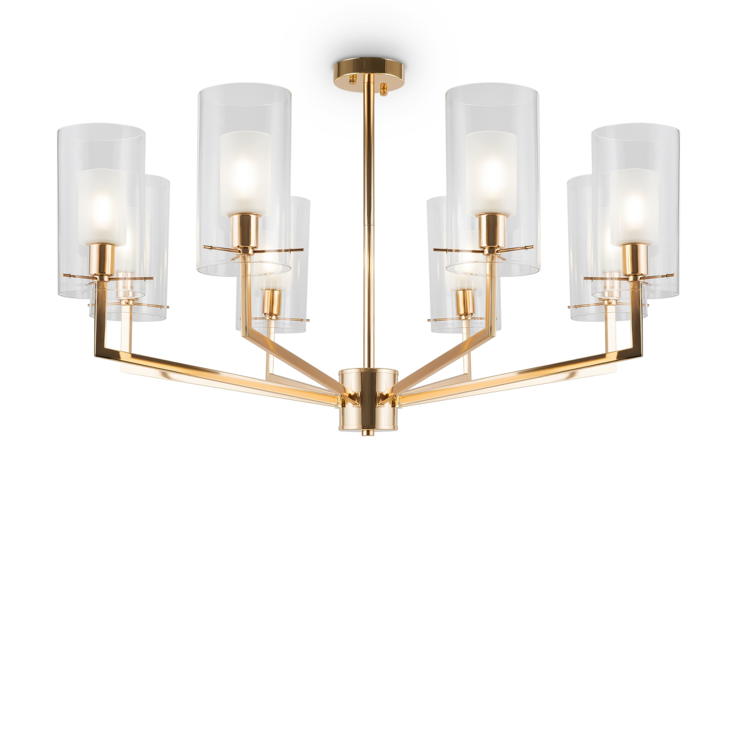 Металлическая арматура оттенка французского золота. Двойные стеклянные плафоны: матовые внутри, прозрачные снаружи. Лаконичная геометрия с симметричным расположением элементов. Источник света – лампа с цоколем E14.