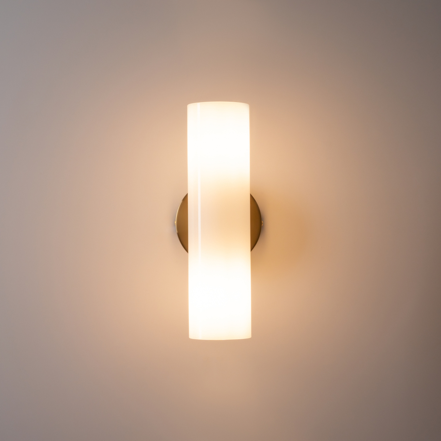 Арматура — металлическая, цвет — латунь. Стеклянные белые плафоны-цилиндры мягко рассеивают свет в стороны. Открытые края плафонов и глянцевая поверхность дают дополнительный свет в вверх и вниз для максимальной освещенности. Источник света — лампа с цоколем Е14.