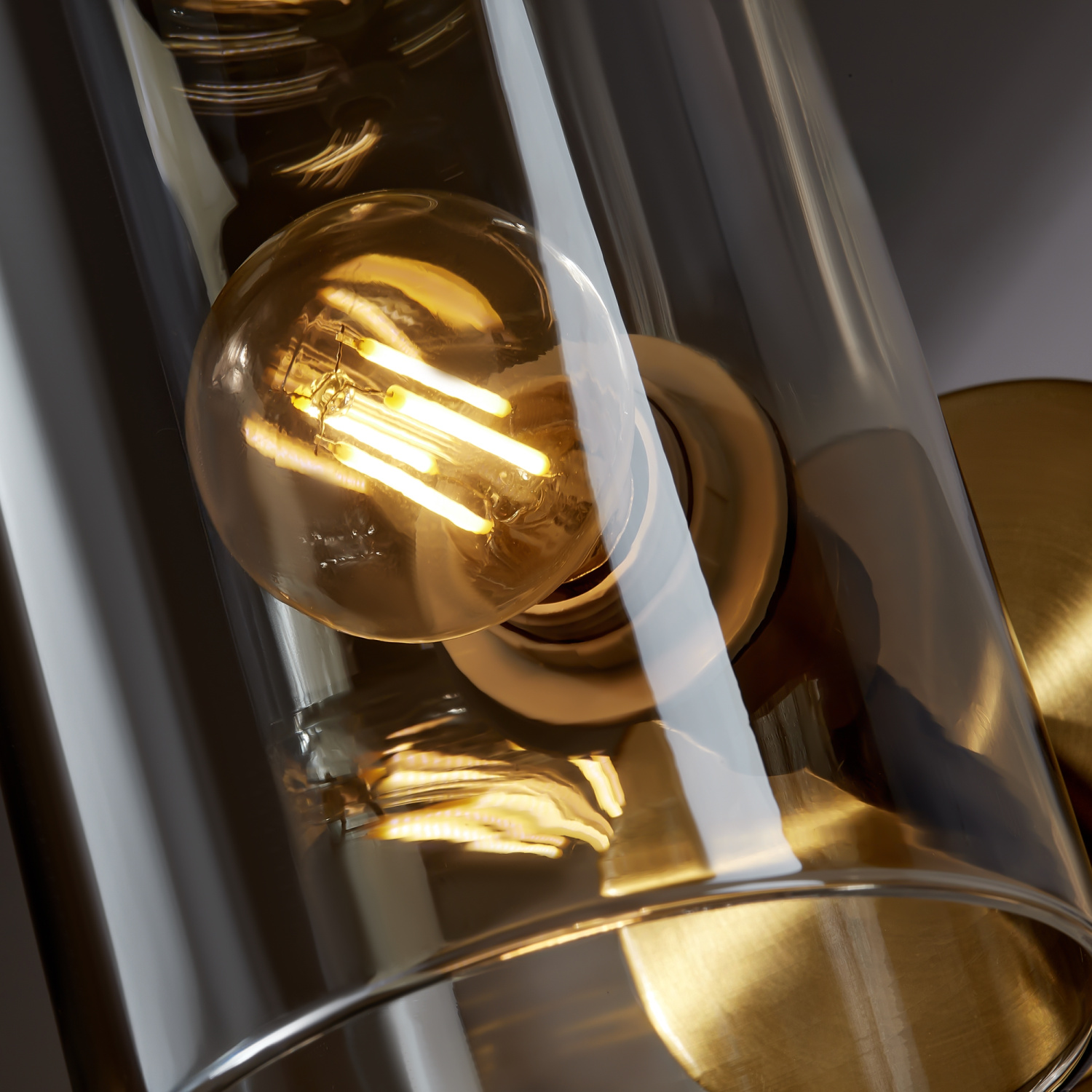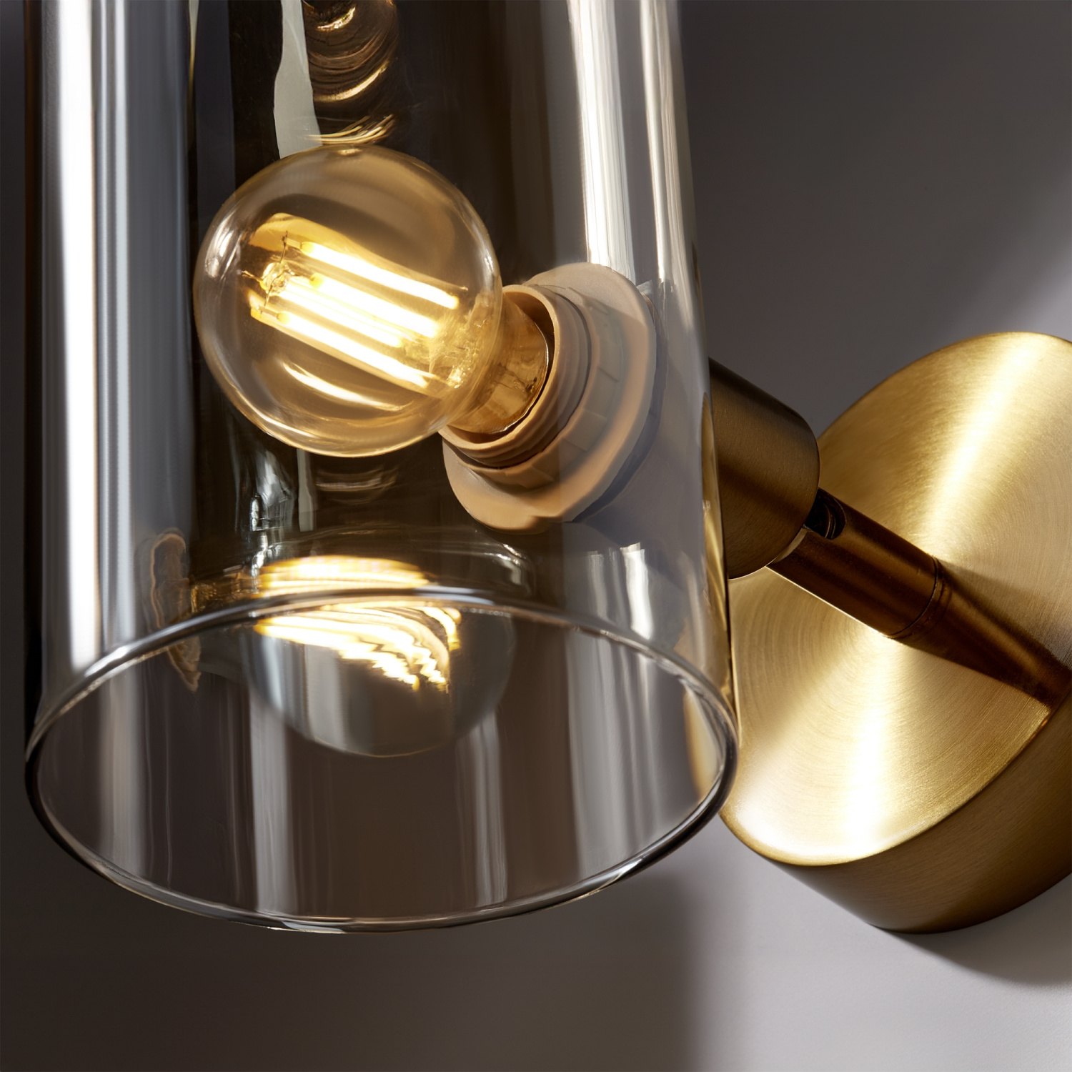 Арматура — металл. Цвет — латунь. Горизонтальные подвесы на твердой ножке. Плафоны из коньячного стекла в форме конуса. Направление плафона у настенного светильника можно регулировать за металлическое основание. Источник света лампа. Цоколь E14.