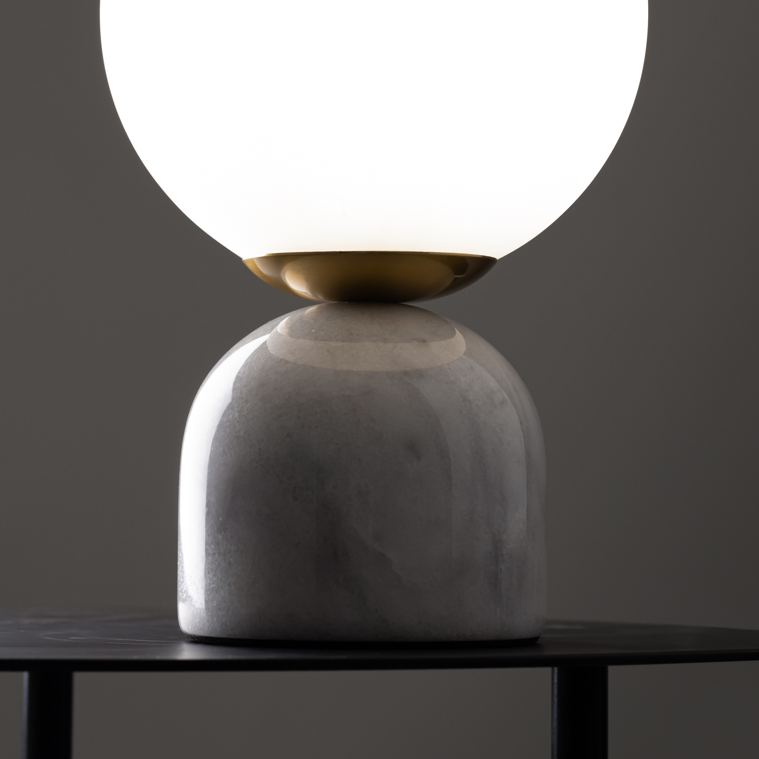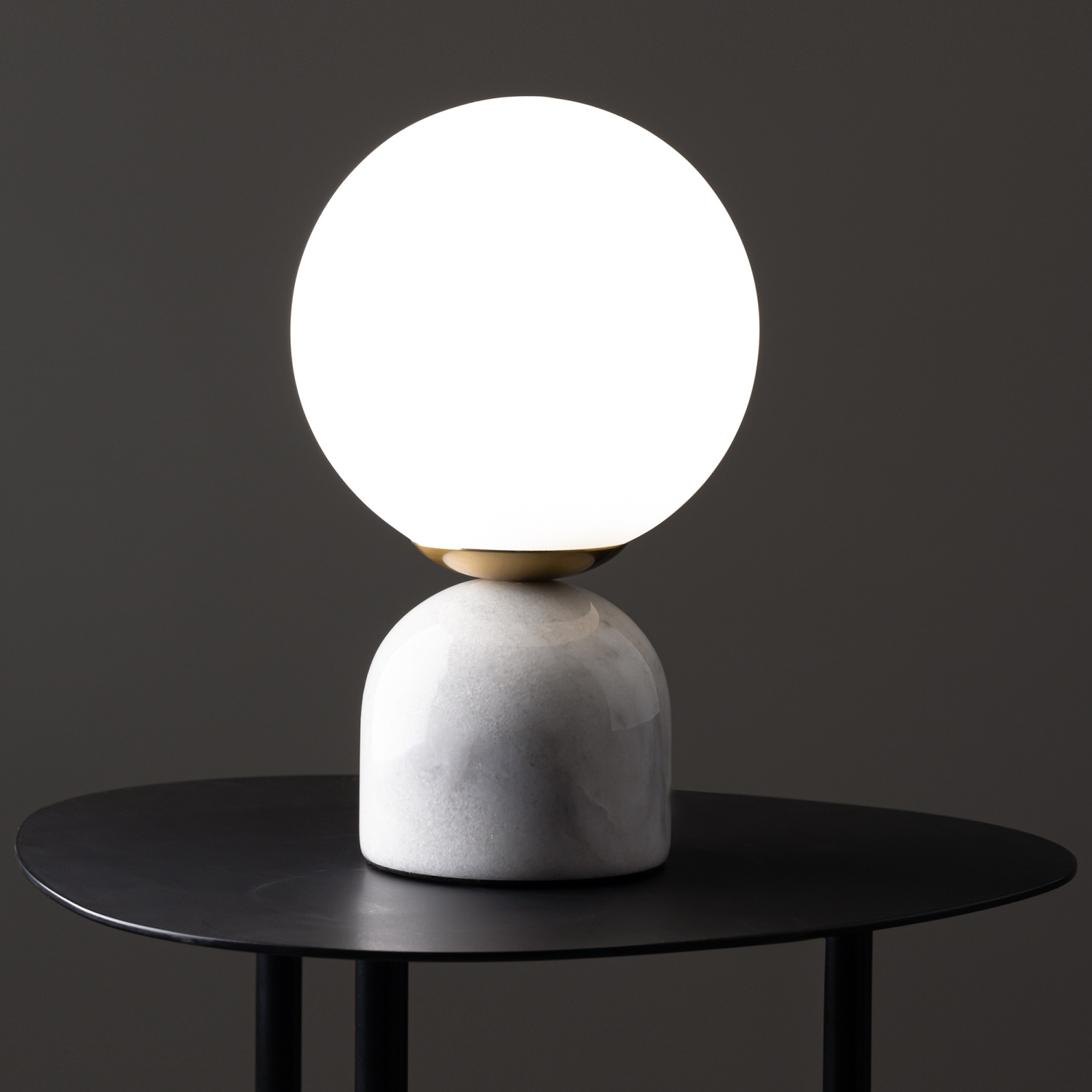 Материал основания — натуральный мрамор с уникальным рисунком. Цвета — белый, черный. Шаровидный плафон. Источник света — лампа с цоколем E14.