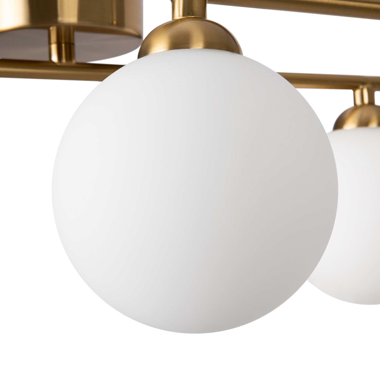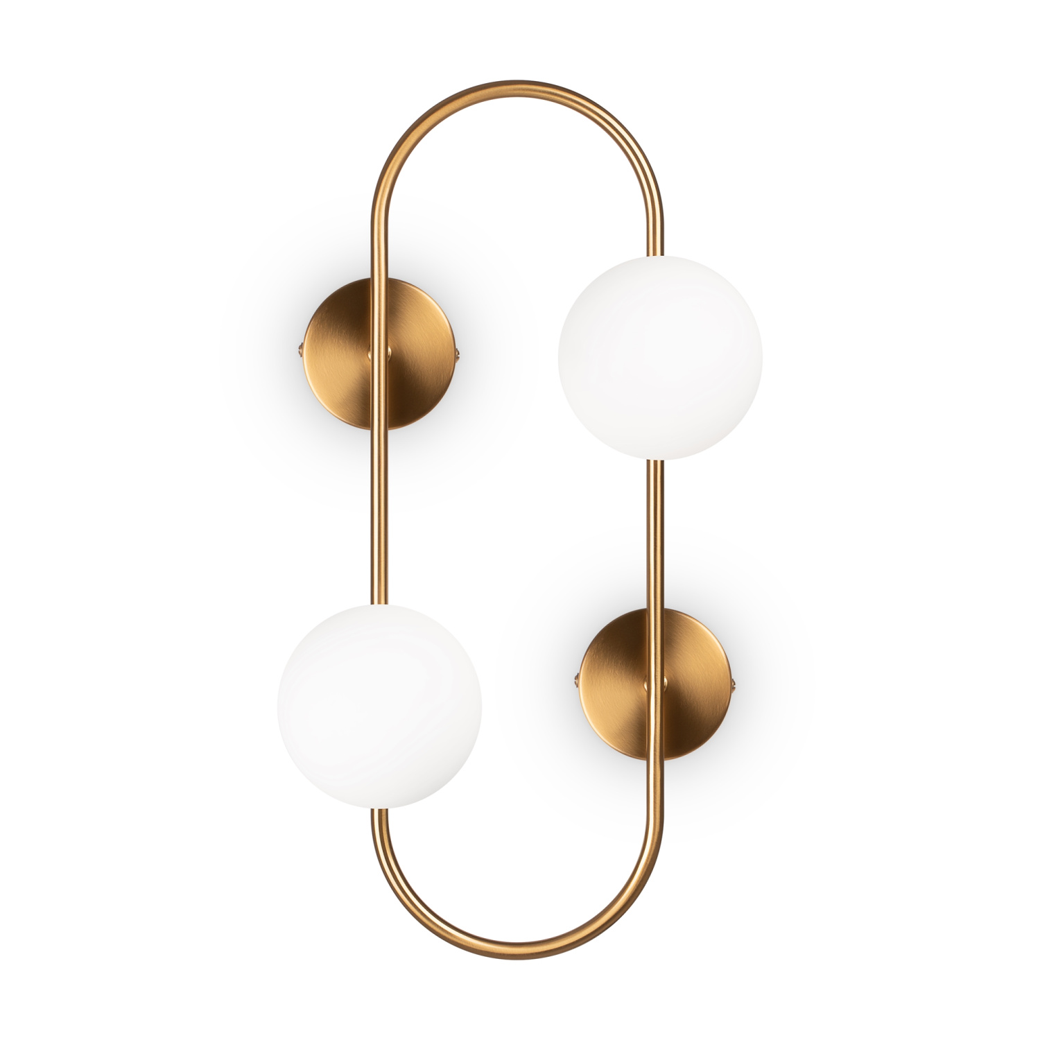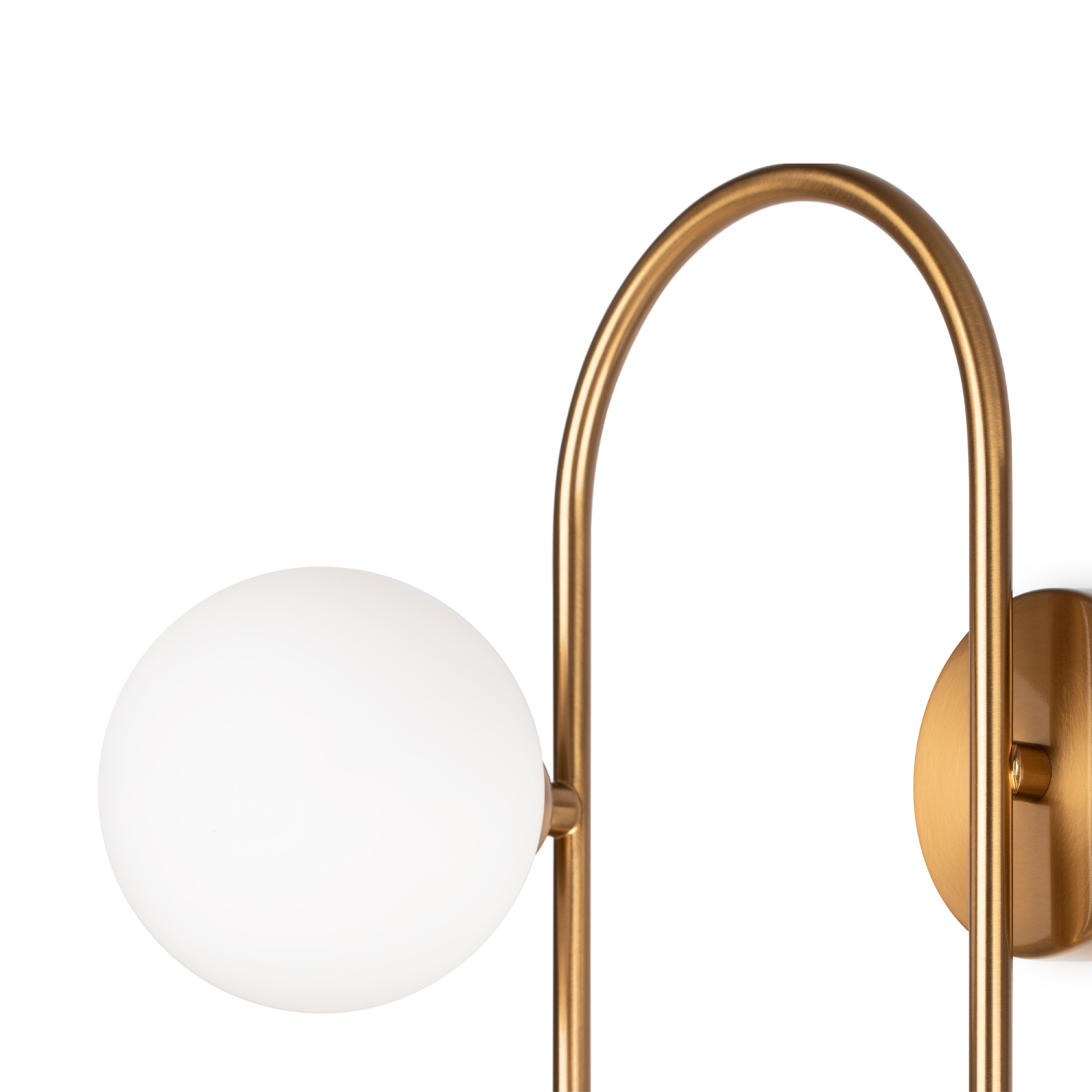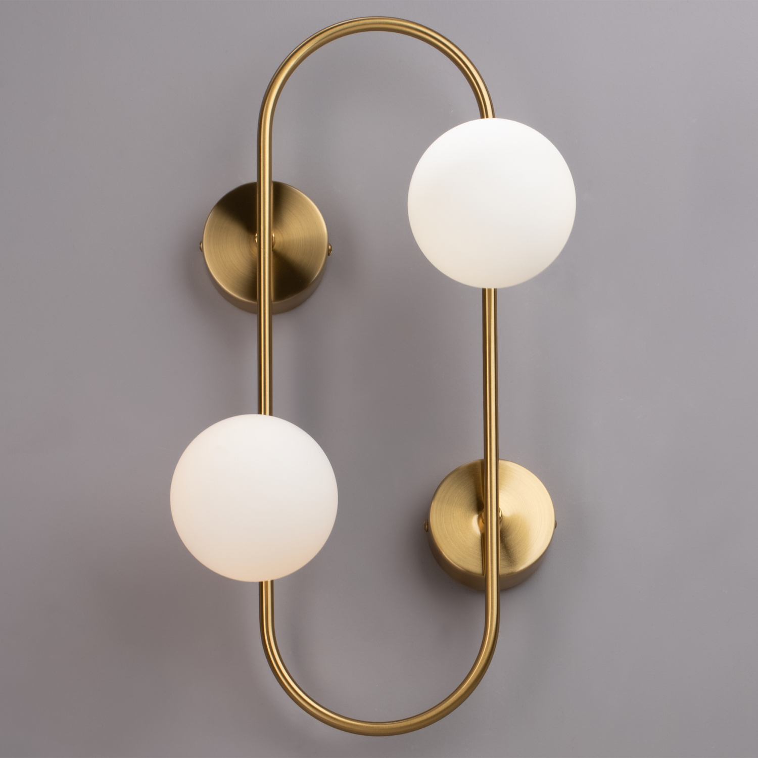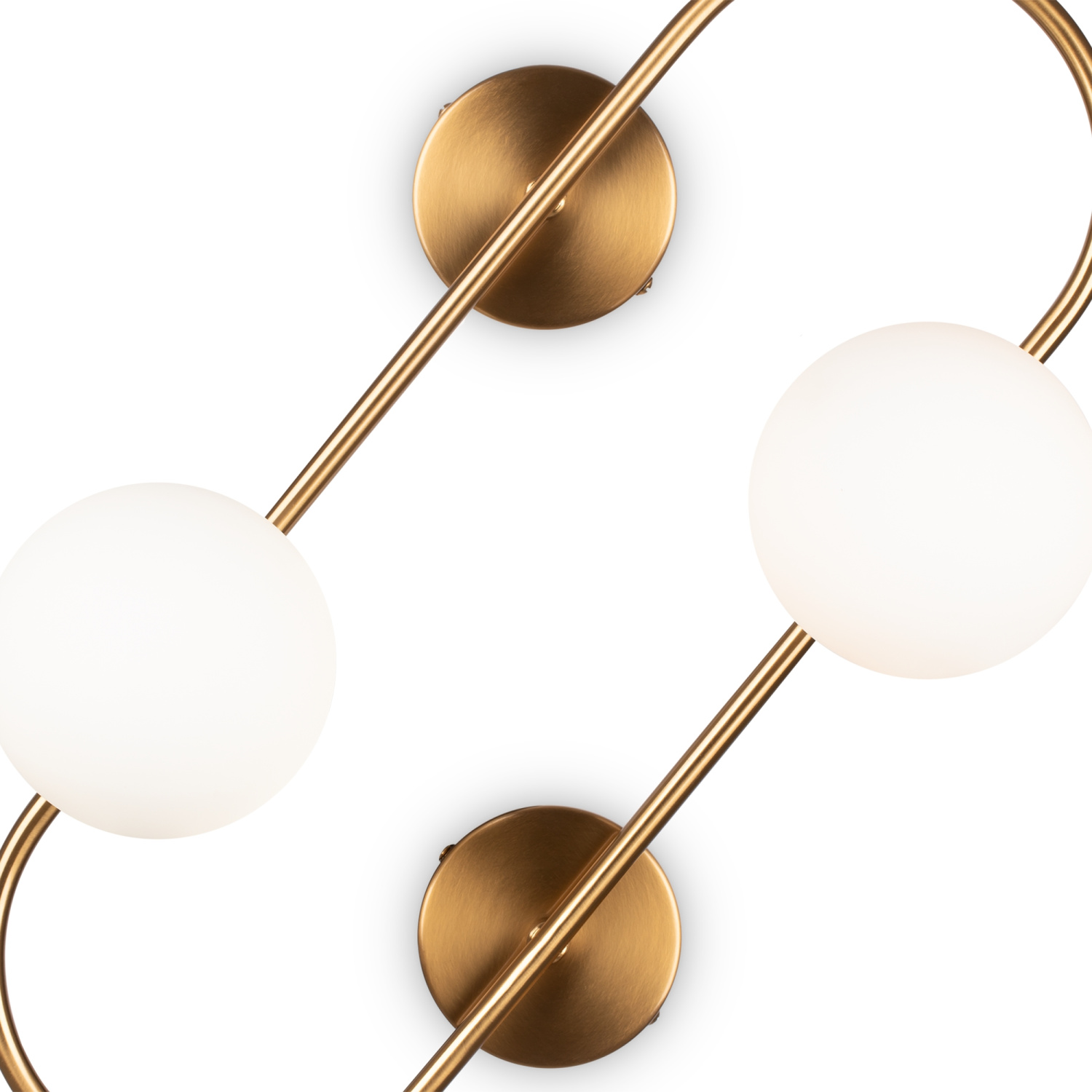 Арматура - металл, цвет - латунь. Стеклянные плафоны-сферы в двух оттенках белый матовый и дымчатый в настенно потолочной версии. Округлые и плавные линии - беспроигрышное сочетание для современных интерьеров. Настенные бра можно использовать как для общего на потолке так и для зонального настенного освещения Источник света - лампа с цоколем G9.