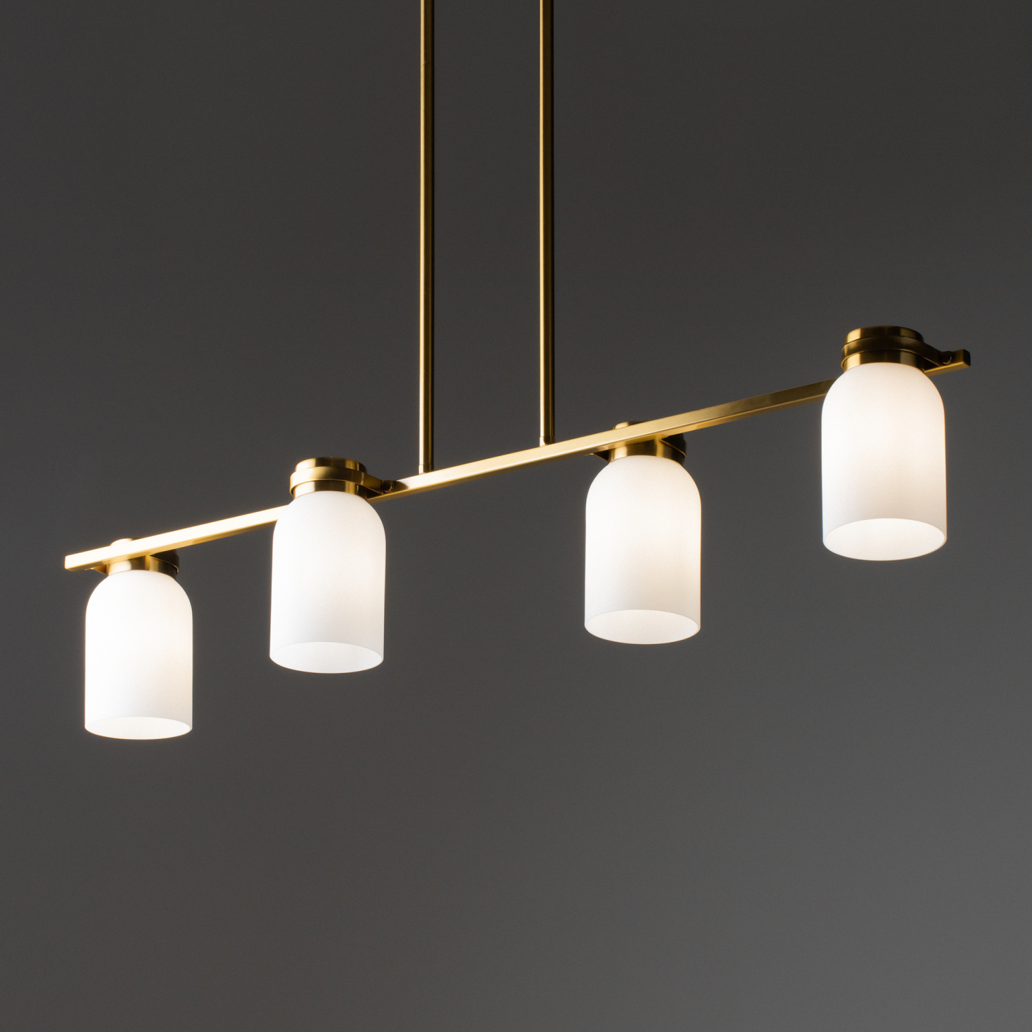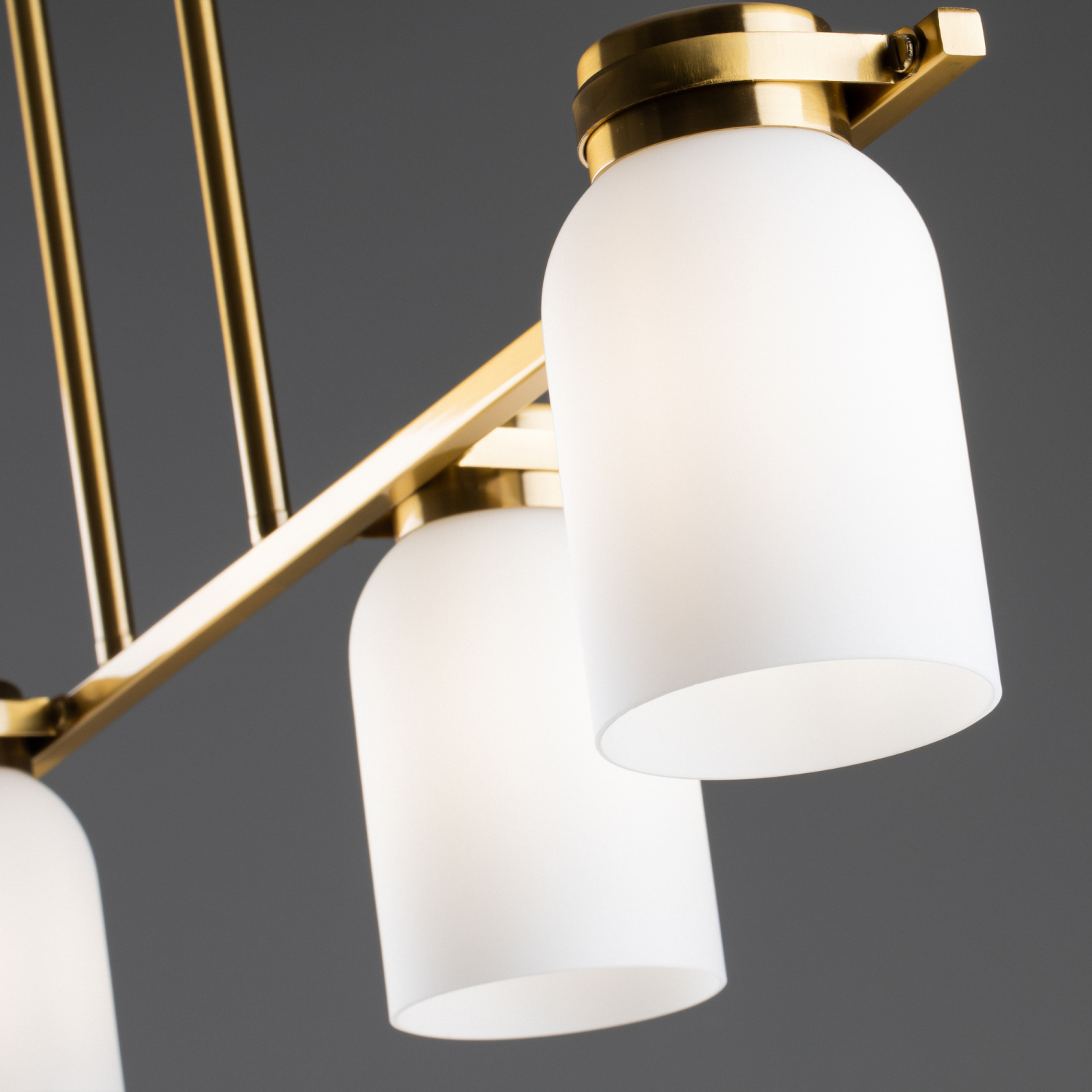 Арматура из металла. Цвет латунь. Плафоны из белого стекла новой необычной формы. Два варианта светильников — потолочные и бра. Подходит для помещений с низкими потолками. Источник света — лампа. Цоколь E14.
