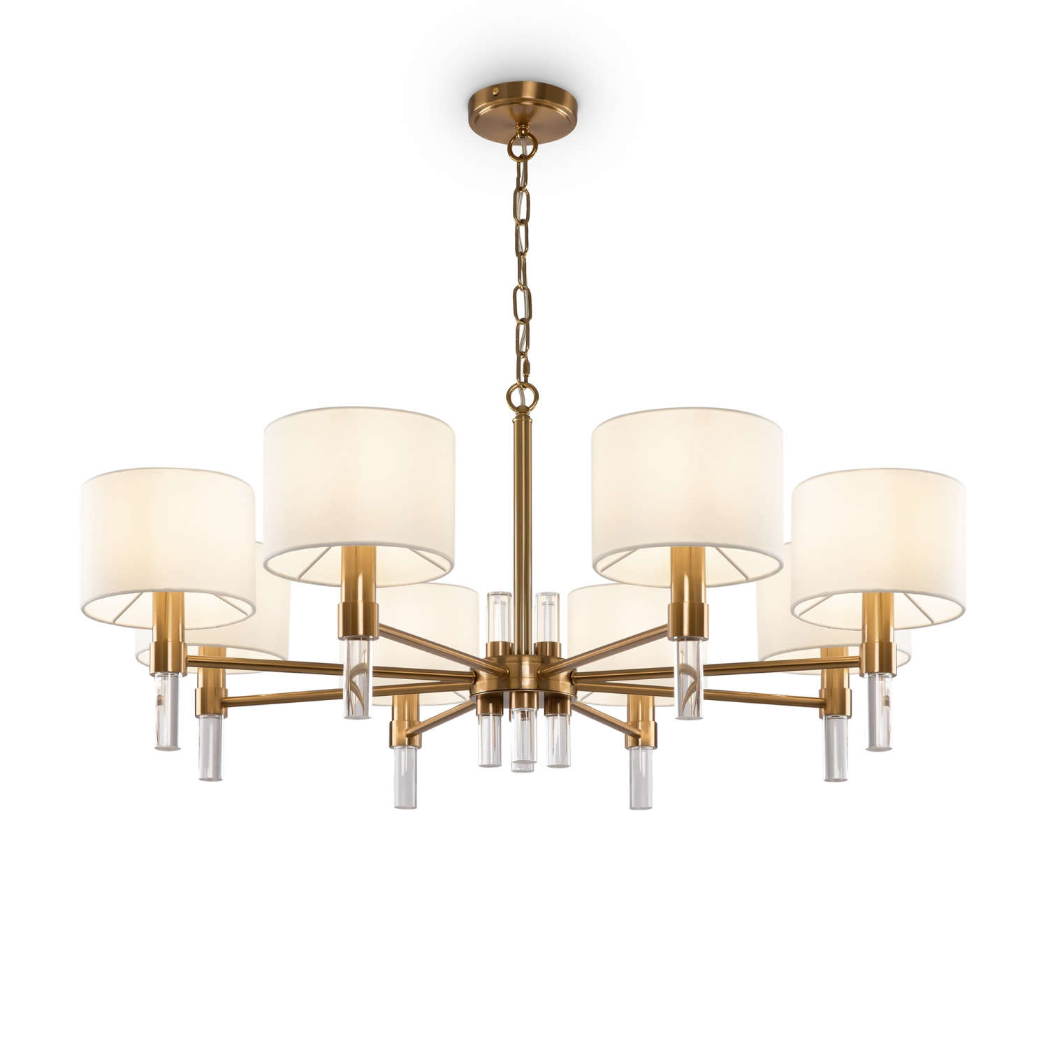 Металлическая арматура. Цвет – латунь. Тканевые абажуры белого оттенка. Декор – прозрачные акриловые трубки. Трендовая комбинация фактур и материалов. Широкий ассортимент. Торшер и подвес с цоколем Е27, лампа, бра и люстры – Е14.