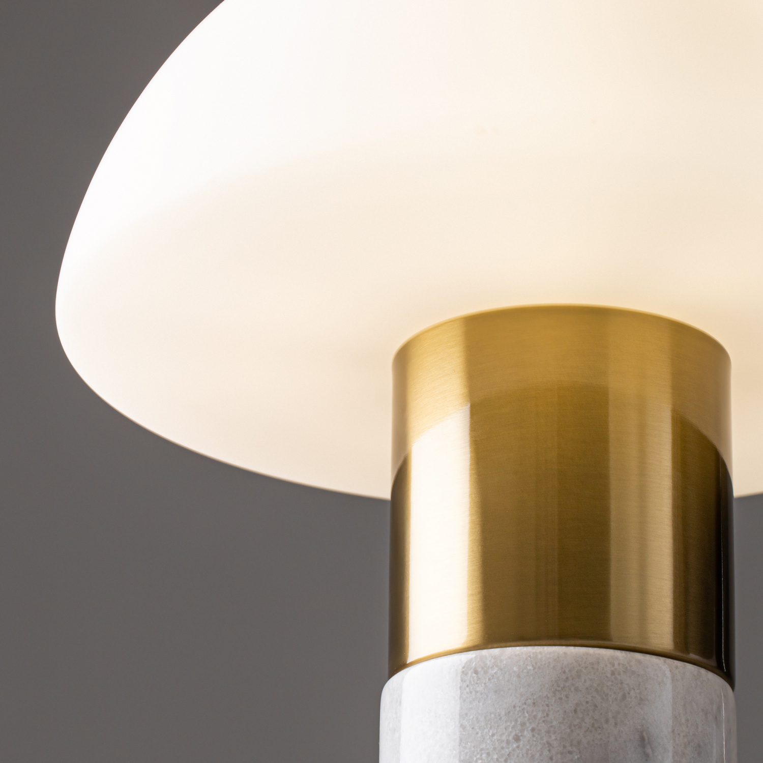 Материал арматуры — метал, цвет — латунь. Основание - белый мрамор с серым рисунком. Плафон из глянцевого стекла в форме полушара. Источник света — лампа с цоколем E14
