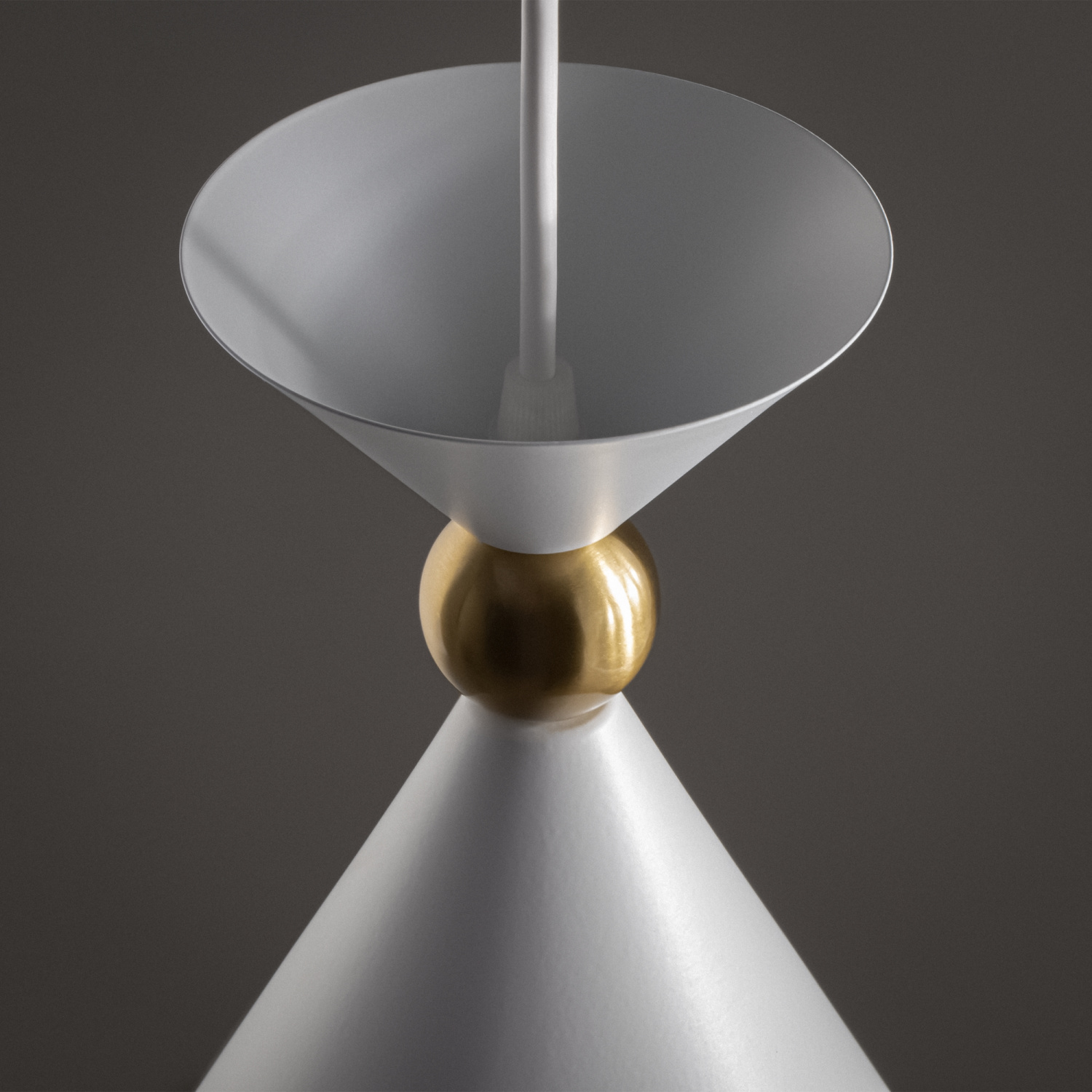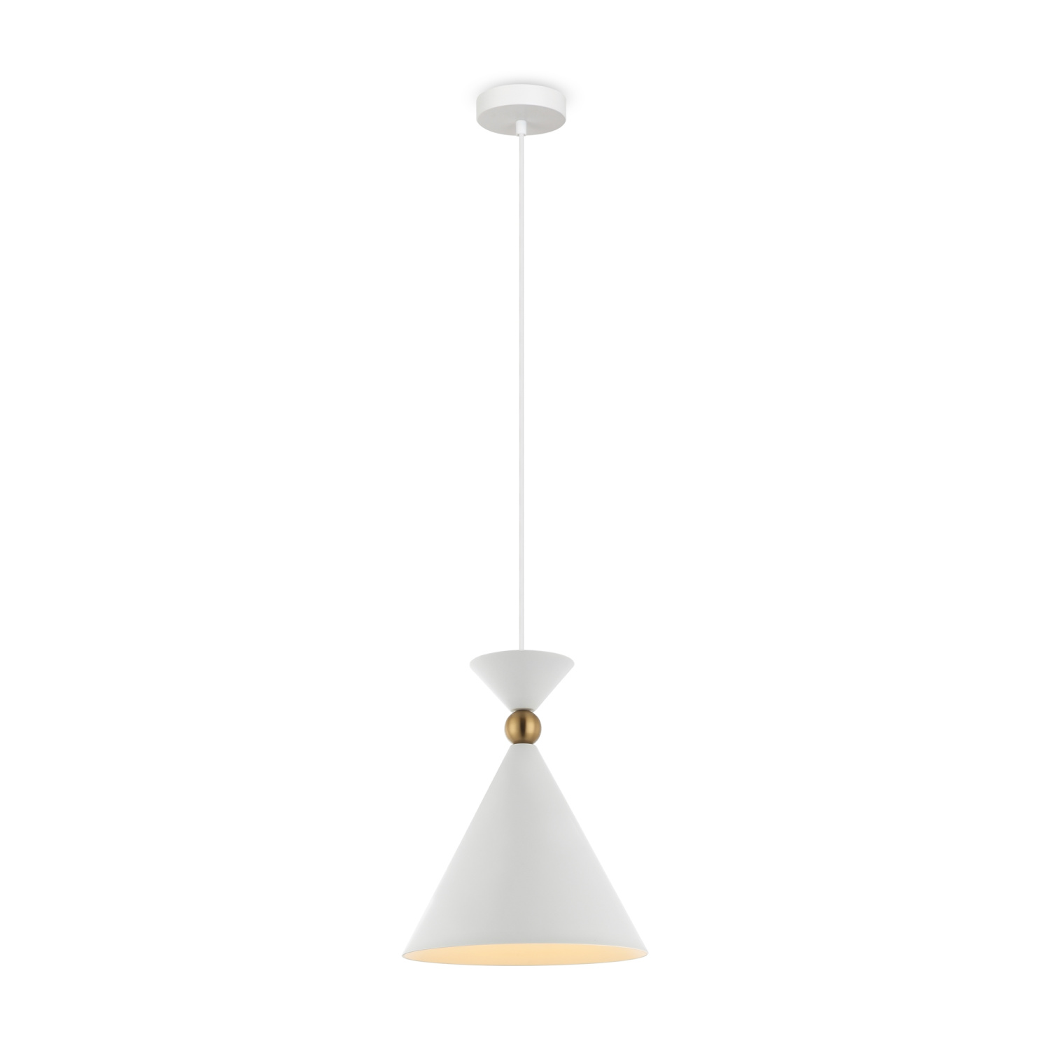 Арматура и плафоны из металла в двух цветах — белом и сером. Плафон состоит из 2-х конусов разных размеров, соединённых золотистым декоративным элементом. Высота регулируется. Идеальны для составления композиций. Источник света — лампа с цоколем Е27.
