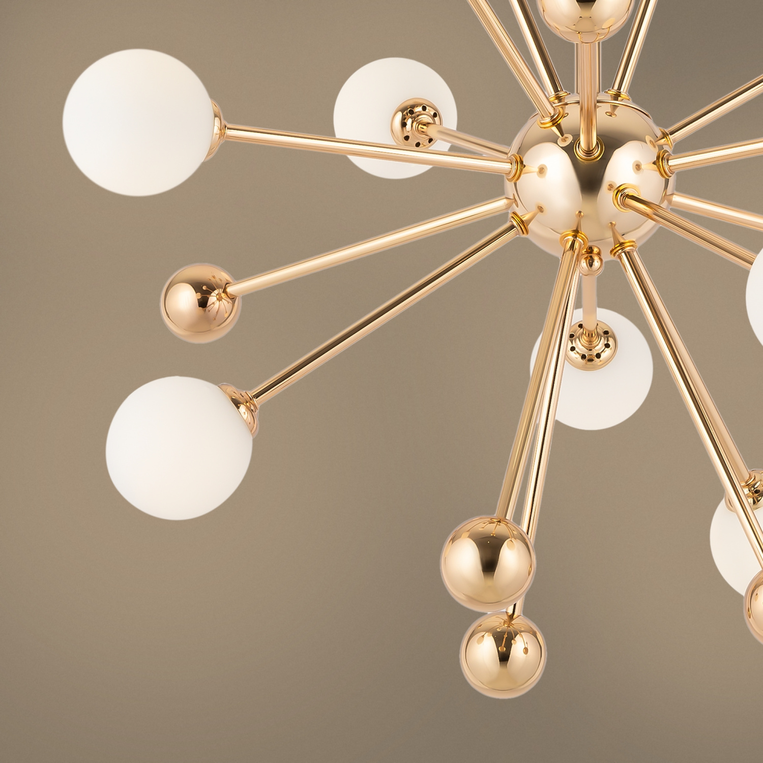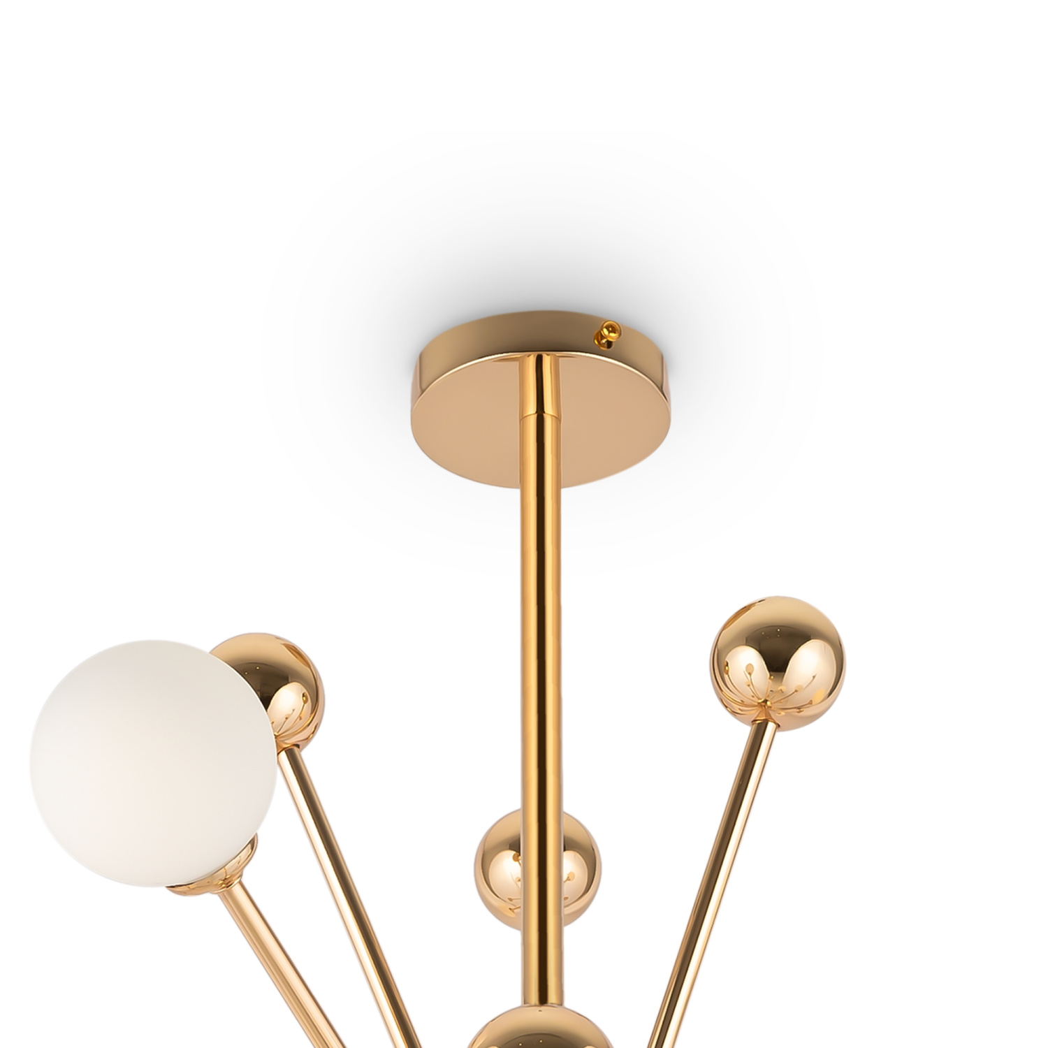 Арматура из металла оттенка французского золота. Плафоны-сферы – матовое белое стекло. Металлический декор окрашен в тон арматуре. Трендовый дизайн в стиле ретрофутуризма. Источник света – лампа G9.