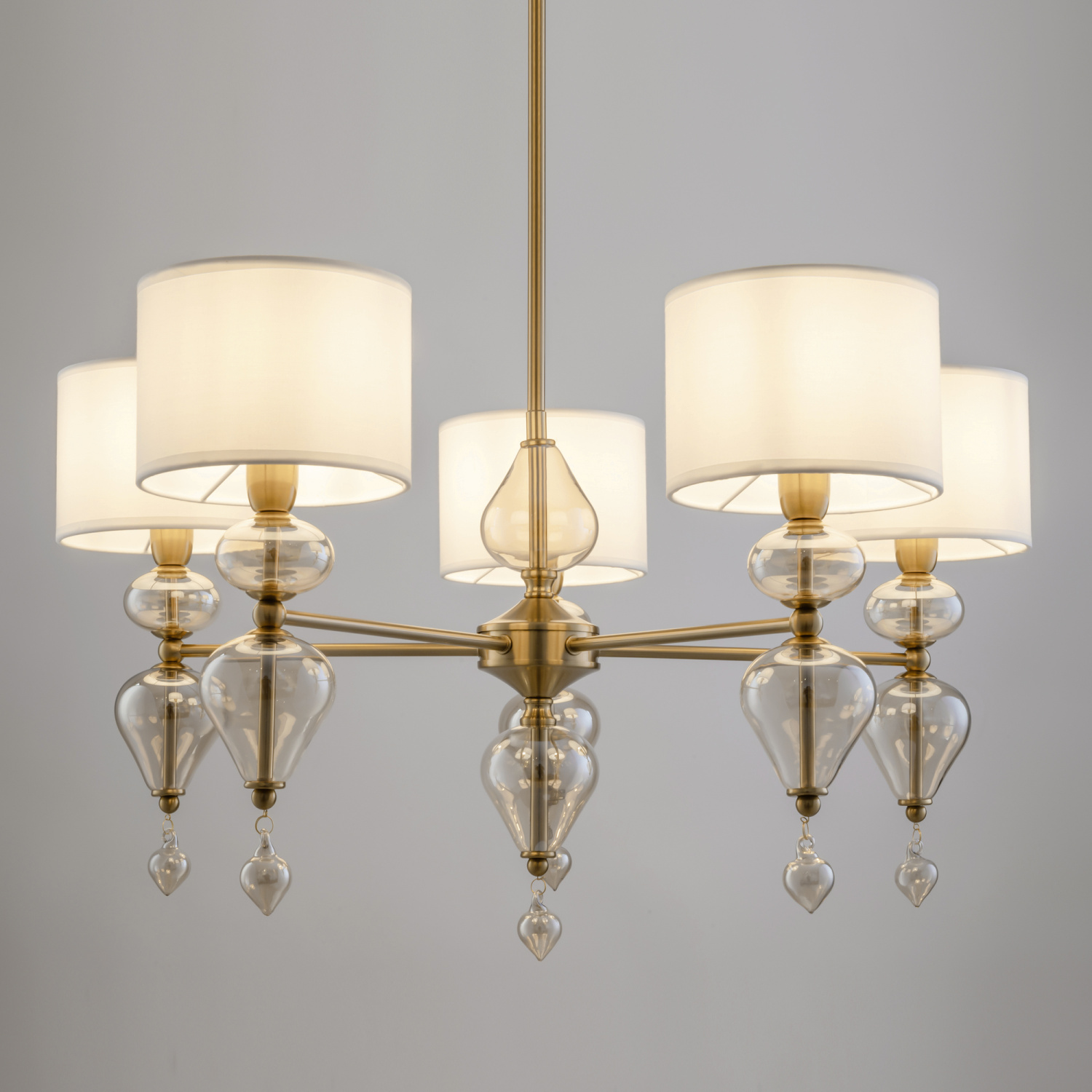 Арматура из металла, цвет — латунь. Плафоны — тканевые, молочного цвета. Металлическая конструкция декорирована выдувными стеклянными элементами с перламутровым напылением. Источником света служит лампа с цоколем Е14.