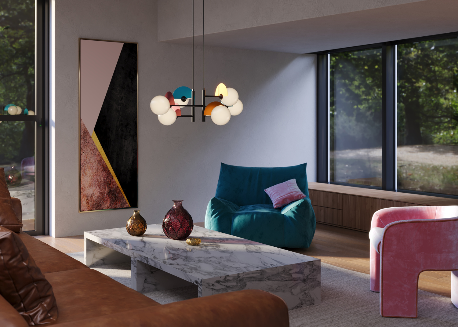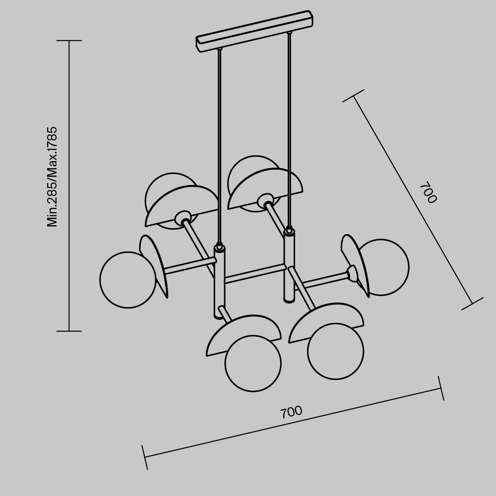 Арматура — металл, цвет — разноцветный или латунь. Белые матовые плафоны из стекла украшены металлическими золотыми или цветными лепестками. Динамичный дизайн для интерьеров в стиле Мемфис. Разнообразие форм в одной конструкции позволяет создать яркое освещение в больших комнатах. Высота регулируется. Источником света служит лампа с цоколем G9.