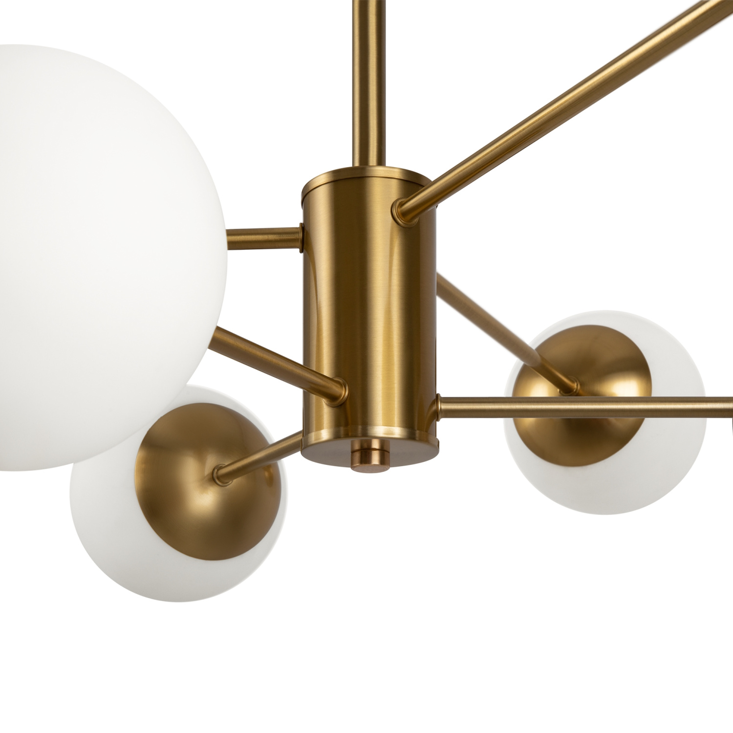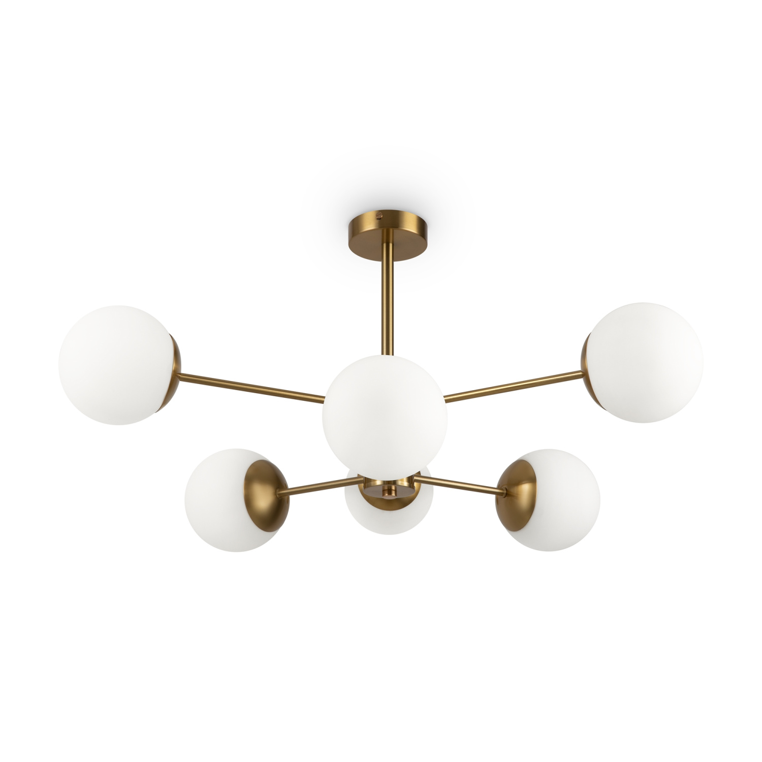 Материал арматуры – металл, цвет – латунь. Плафоны из матового белого стекла. Декор плафонов – металлический кант в тон арматуре. Оригинальная геометрия в дизайне создает динамичный образ. Источник света – лампа с цоколем Е27.