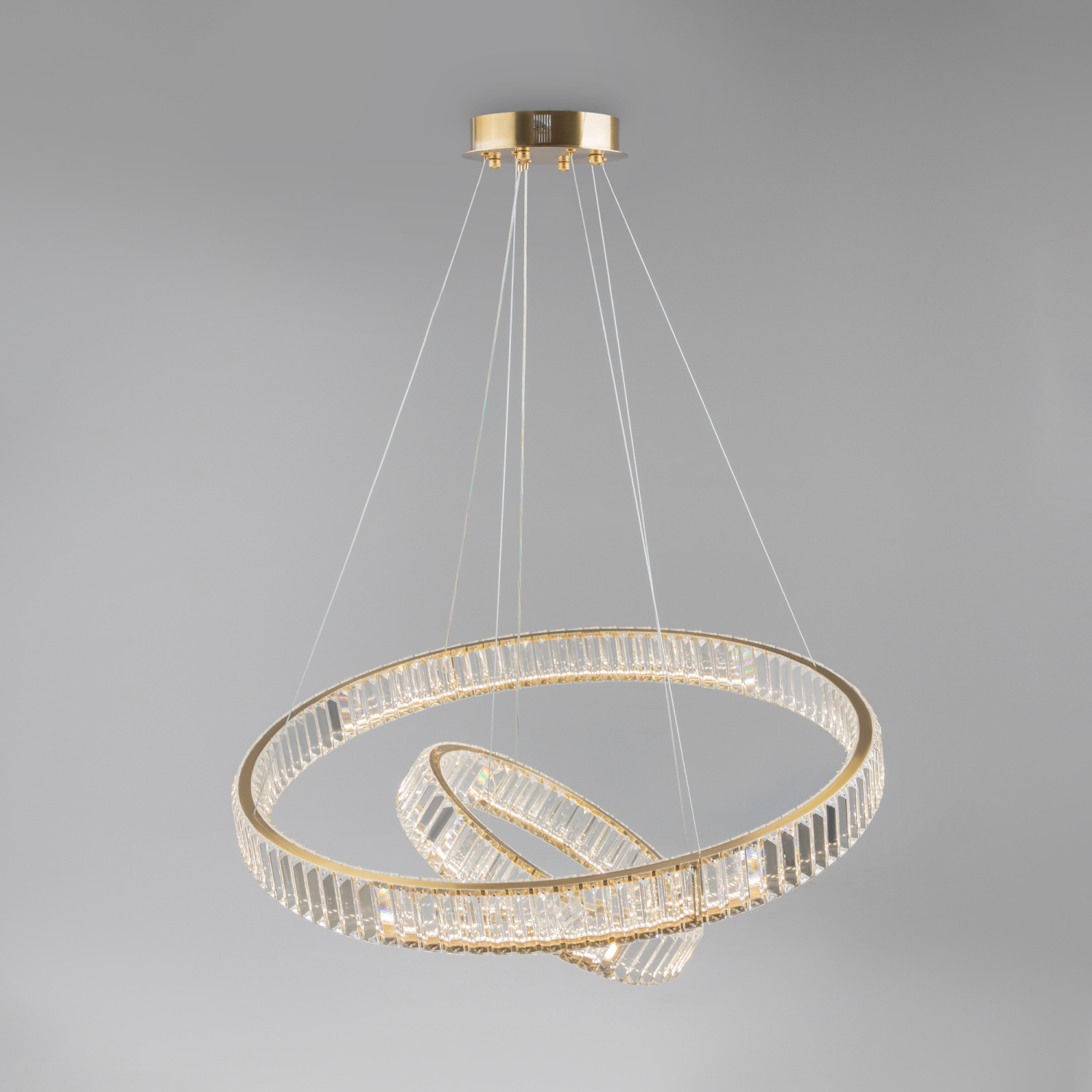 Металлическая арматура в цвете латунь и хром. Хрустальные декоративные кольца с геометричными гранями. LED-источник света. Регулировка цветовой температуры (3000-4000-5000K) и яркости 4G-dimming при помощи пульта (в комплекте).