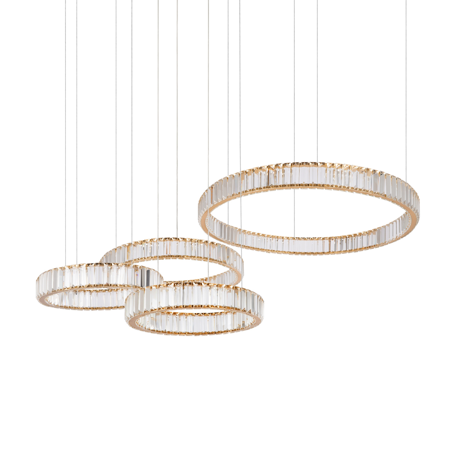 Металлическая арматура в цвете латунь и хром. Хрустальные декоративные кольца с геометричными гранями. LED-источник света. Регулировка цветовой температуры (3000-4000-5000K) и яркости 4G-dimming при помощи пульта (в комплекте).
