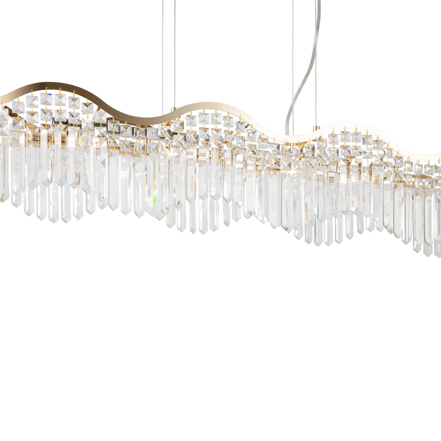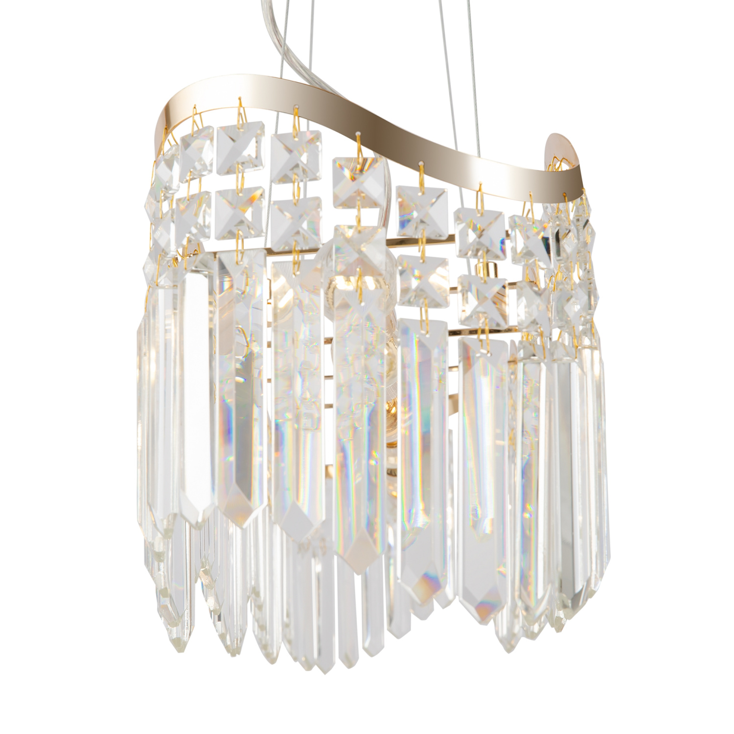 Металлическая арматура в золотом цвете. Декоративные подвески различной формы и огранки. Оригинальные волнообразные очертания светильника. Трендовый эффект парения. Ассортимент для общей и зональной подсветки.