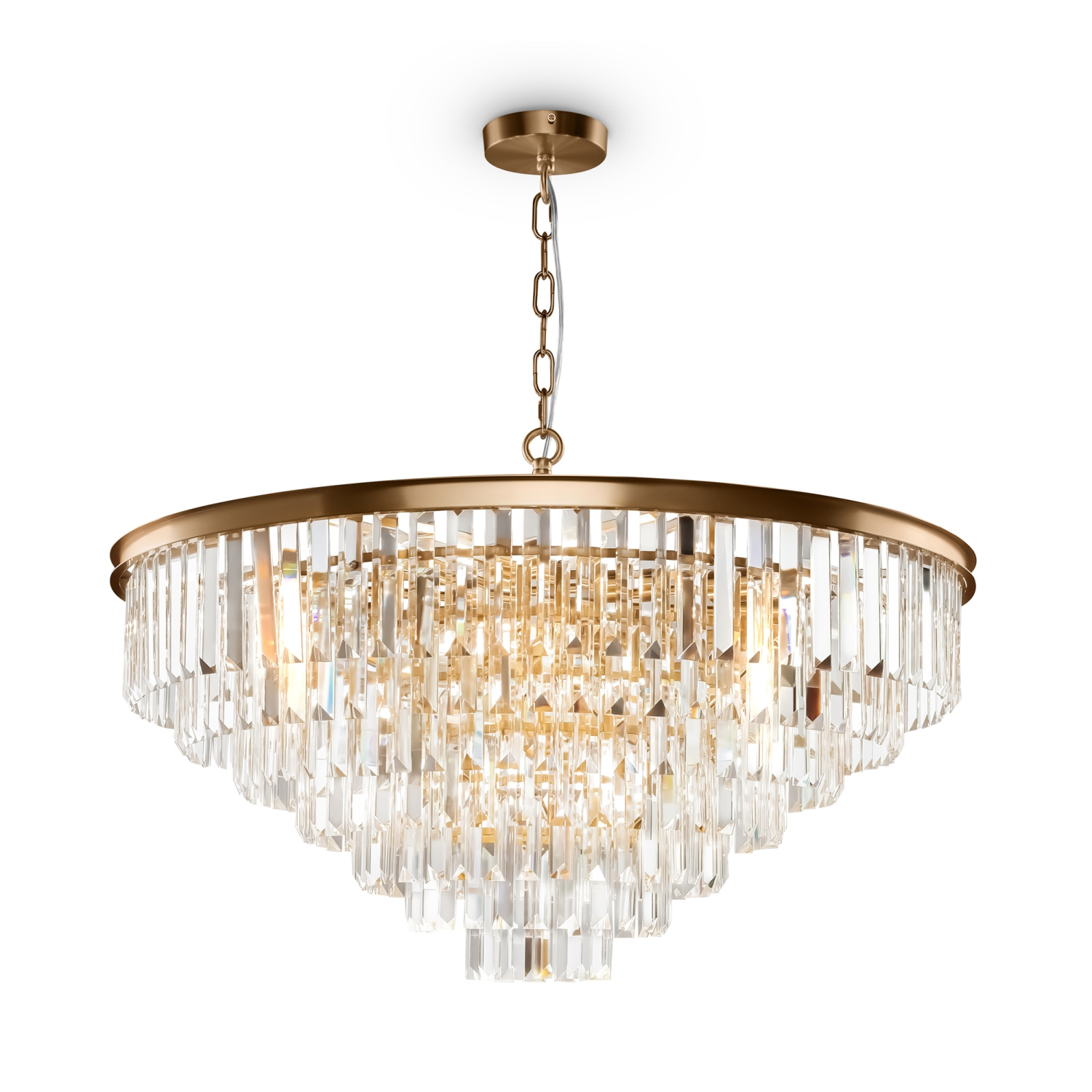Арматура из металла в трех оттенках: латунь, хром, золото. Многоярусный декор. Подвески: прозрачное (арматура – хром, латунь) и янтарное (арматура – золото) стекло. Высота подвесных моделей регулируется.