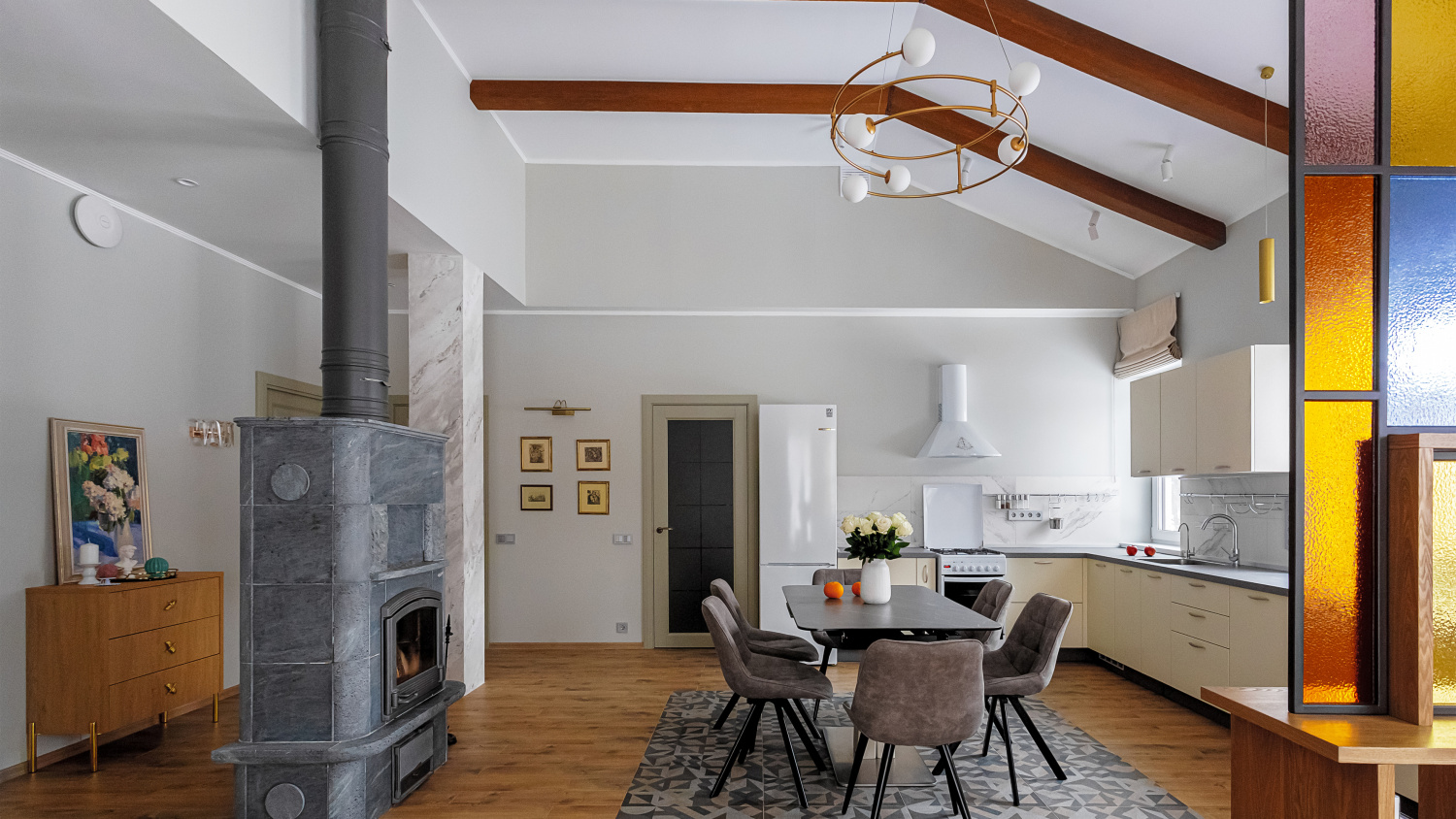 Арматура из металла в двух оттенках: черный и золото. Плафоны из матового выдувного стекла крепятся к металлическим дугам. Высота регулируется с помощью тросов.