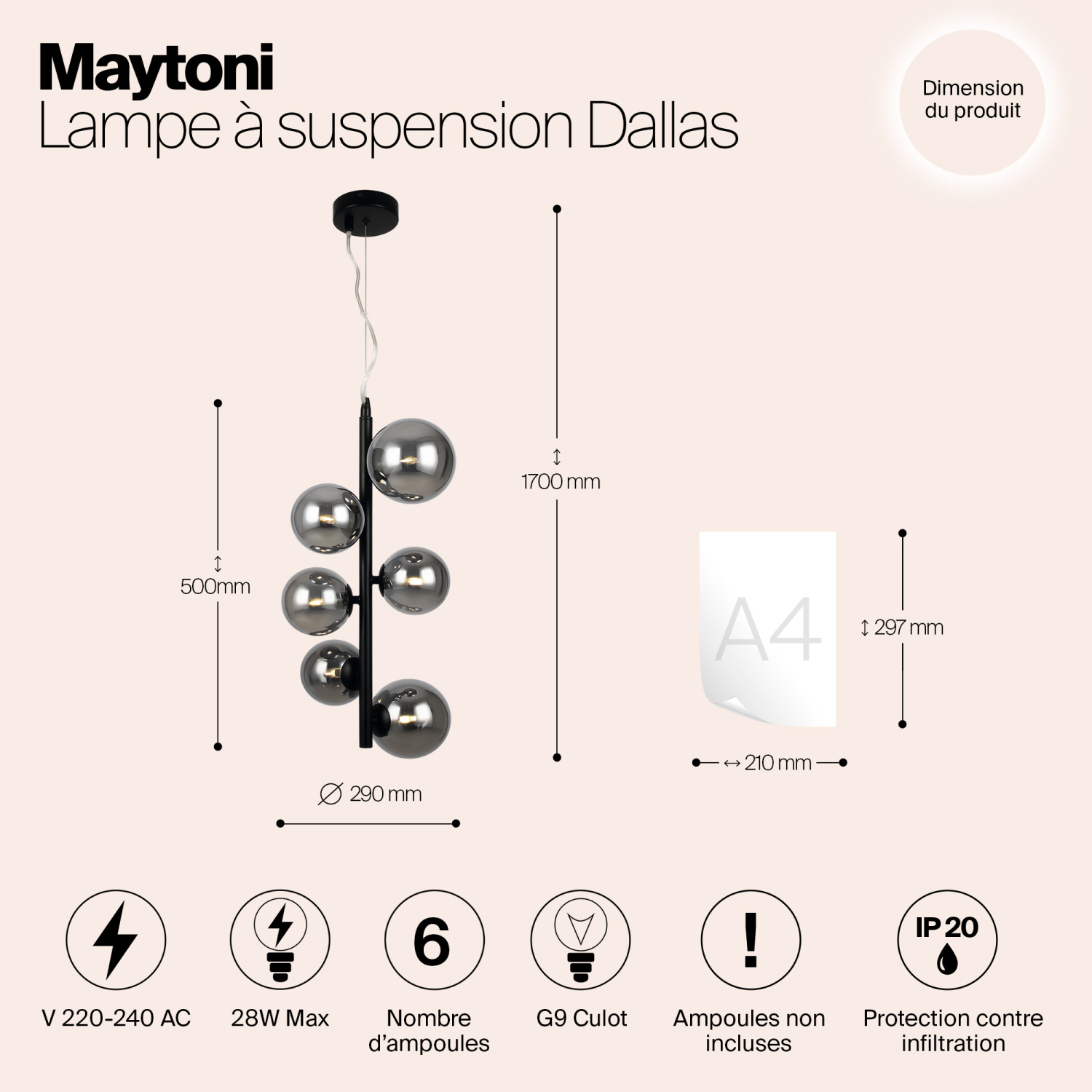 Металлическая арматура в четырех цветах: матовый черный, хром, золото, латунь. Плафоны — выдувное стекло. Цвета — дымчатый, янтарный, коньячный. Дизайн с имитацией молекулярной структуры. Высота подвесных светильников регулируется тросом. Лампа с цоколем G9.