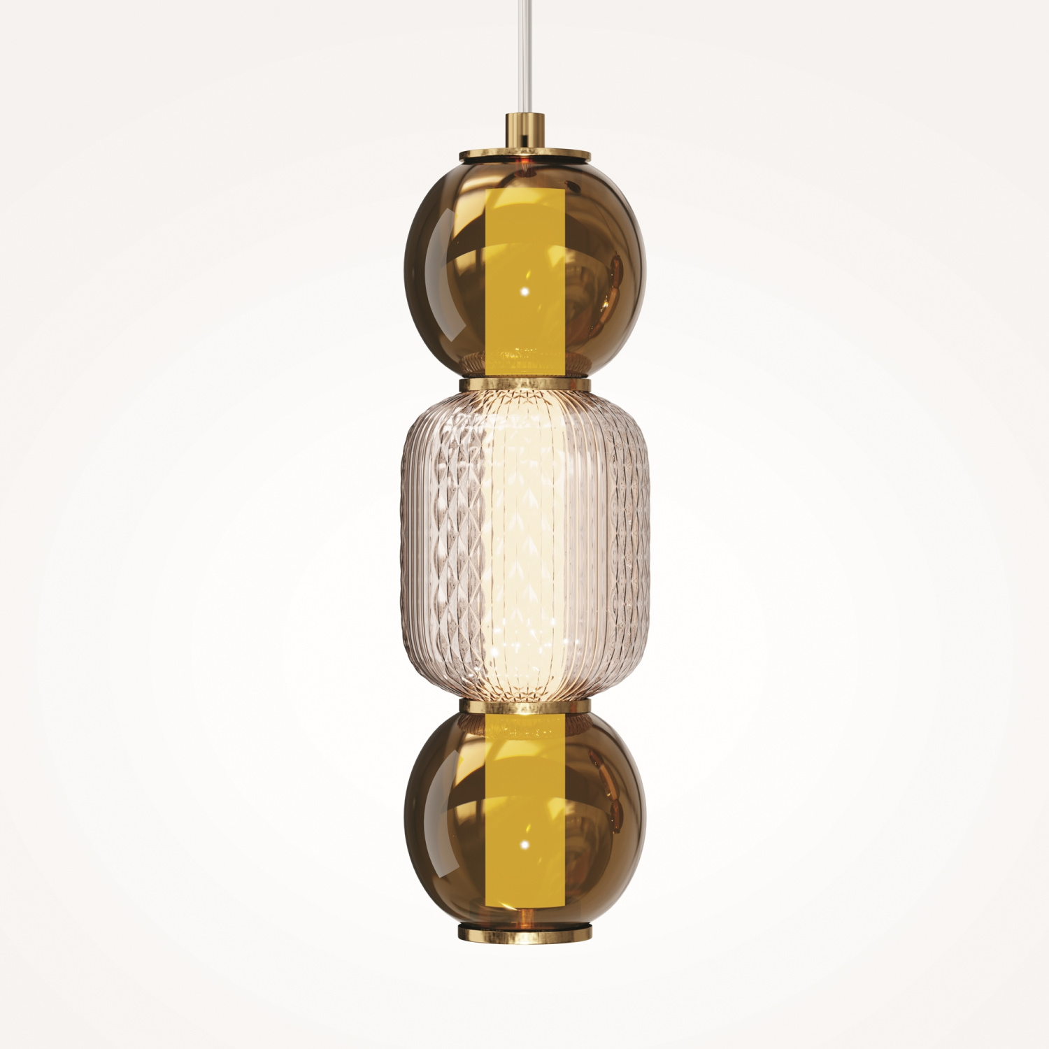 Материал арматуры - металл, цвета - золото, хром. Микс плафонов: гладкие cферы коньячного или дымчатого оттенка + округлые рельефные с ромбовидным узором из прозрачного стекла. Регулируемая высота подвесных моделей - максимальная длина провода 3 метра. LED-источник света, цветовая температура 3000К