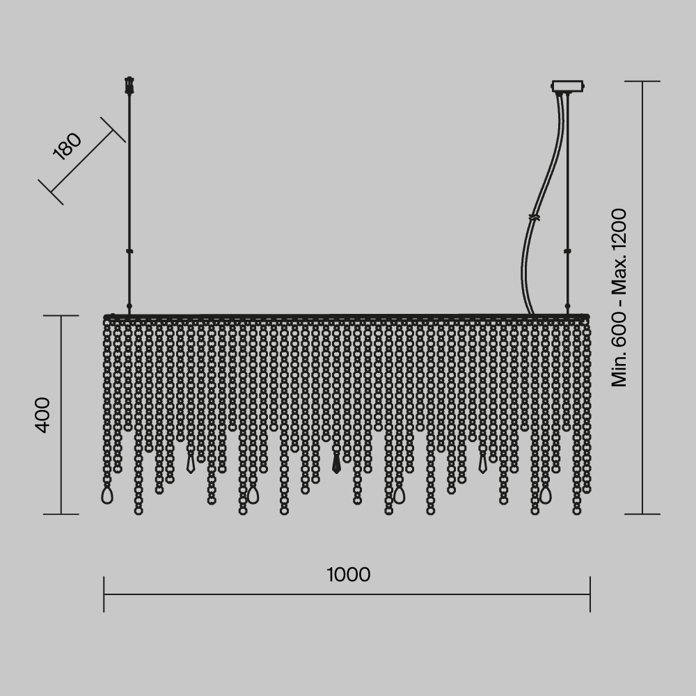 Арматура из металла в цвете хром. Декор – подвески из прозрачного хрусталя. Оригинальная прямоугольная форма. Высота светильников регулируется тросом.
