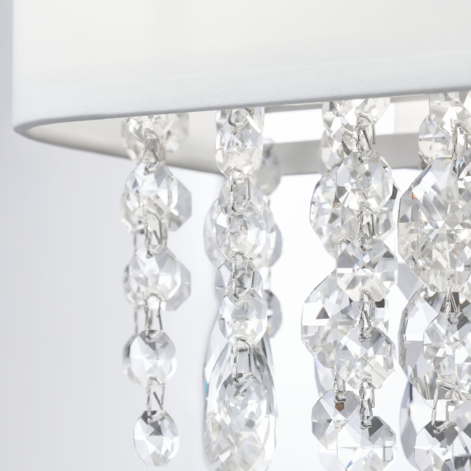 Металлическая арматура в белом цвете. Абажур – ткань, нанесенная на ПВХ, цвет – белый. Декор – подвески в виде граненых кристаллов. Высота подвесных светильников регулируется тросом.