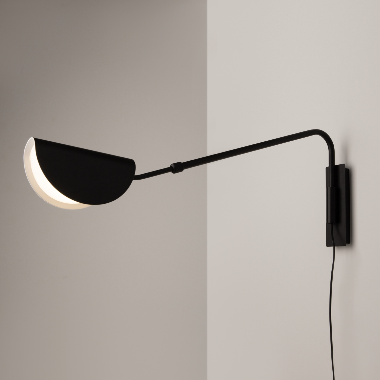 Арматура и плафоны из металла, цвет – черный. Оригинальная форма плафона с плавным контуром. Источники света скрыты под акриловым рассеивателем.
