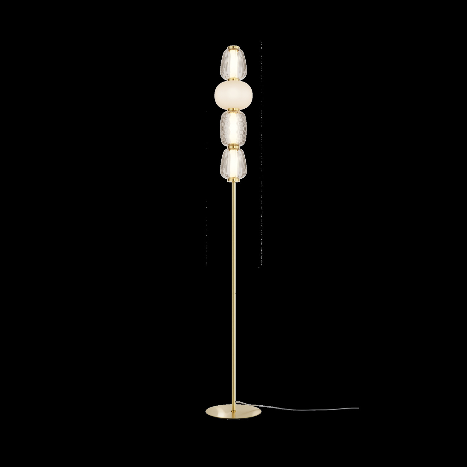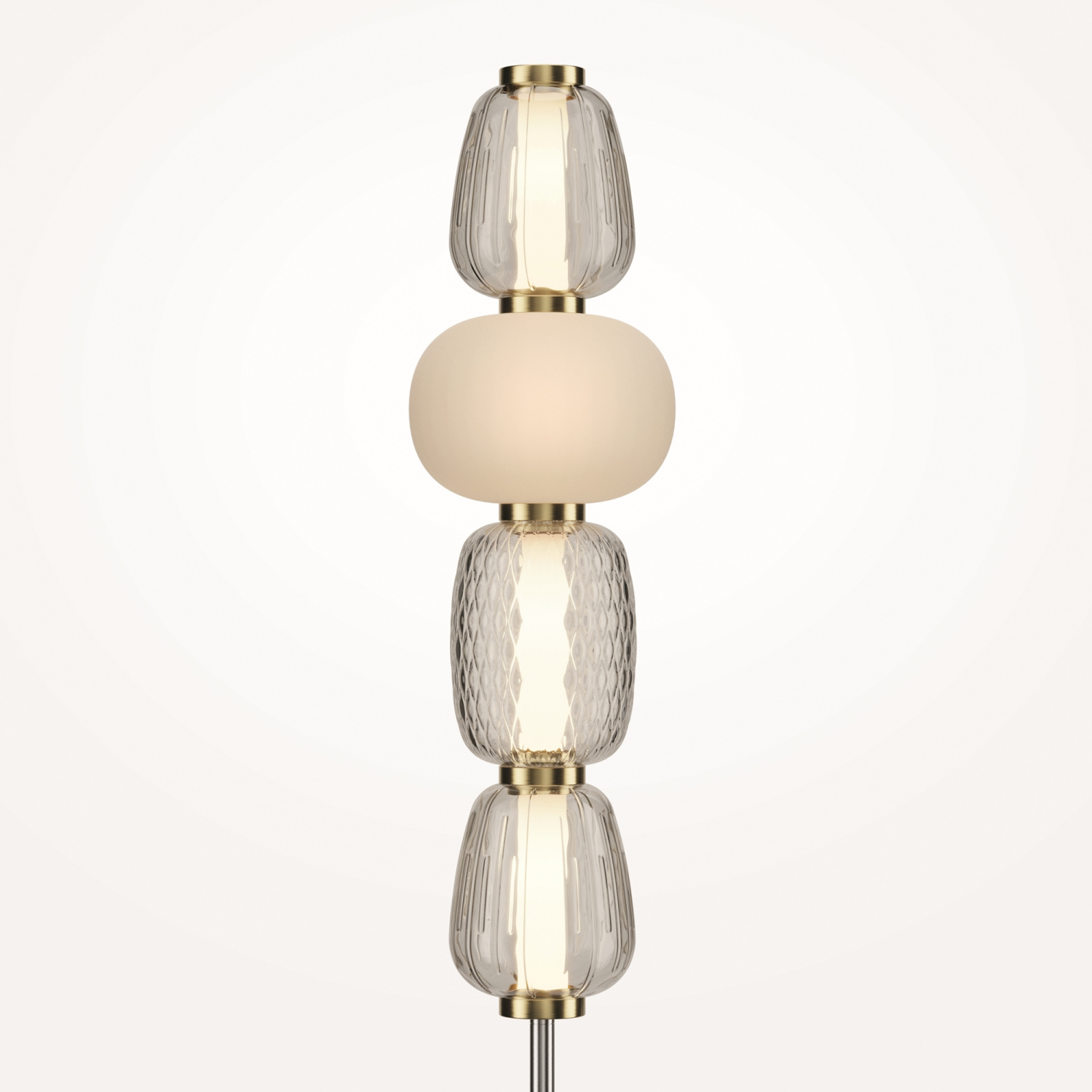 Металлическая арматура, цвет - золото, хром. Микс плафонов округлых и вытянутых форм из белого матового и прозрачного стекла с сетчатым и с линейным повторяющимся рельефным рисунком. Регулируемая высота подвесных моделей, провод - 3 метра. LED-источник света, цветовая температура 3000К.