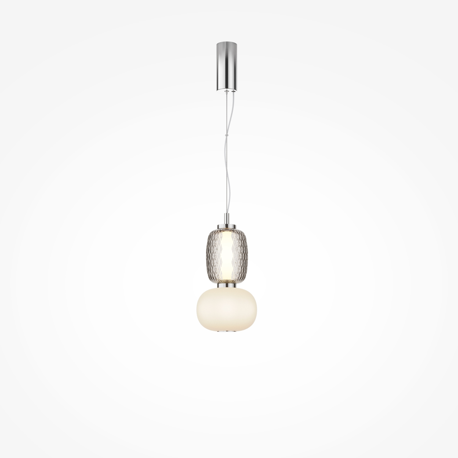 Металлическая арматура, цвет - золото, хром. Микс плафонов округлых и вытянутых форм из белого матового и прозрачного стекла с сетчатым и с линейным повторяющимся рельефным рисунком. Регулируемая высота подвесных моделей, провод - 3 метра. LED-источник света, цветовая температура 3000К.