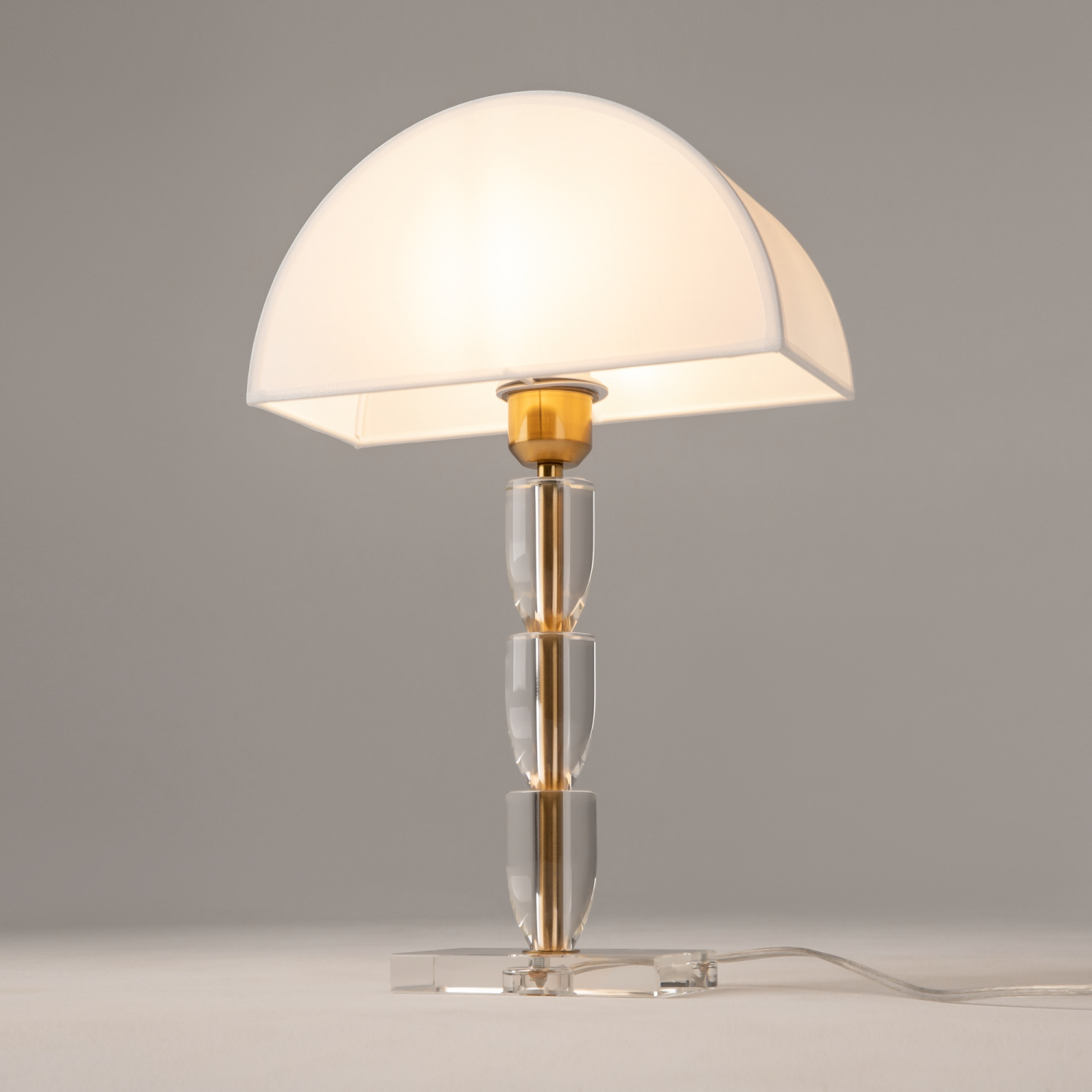 Арматура – металл, цвета – хром, латунь. Хлопковый абажур в белом цвете. Прозрачный акриловый декор в основании. Эстетика Баухауса, трендовая форма абажура. Источник света - лампа с цоколем Е27.