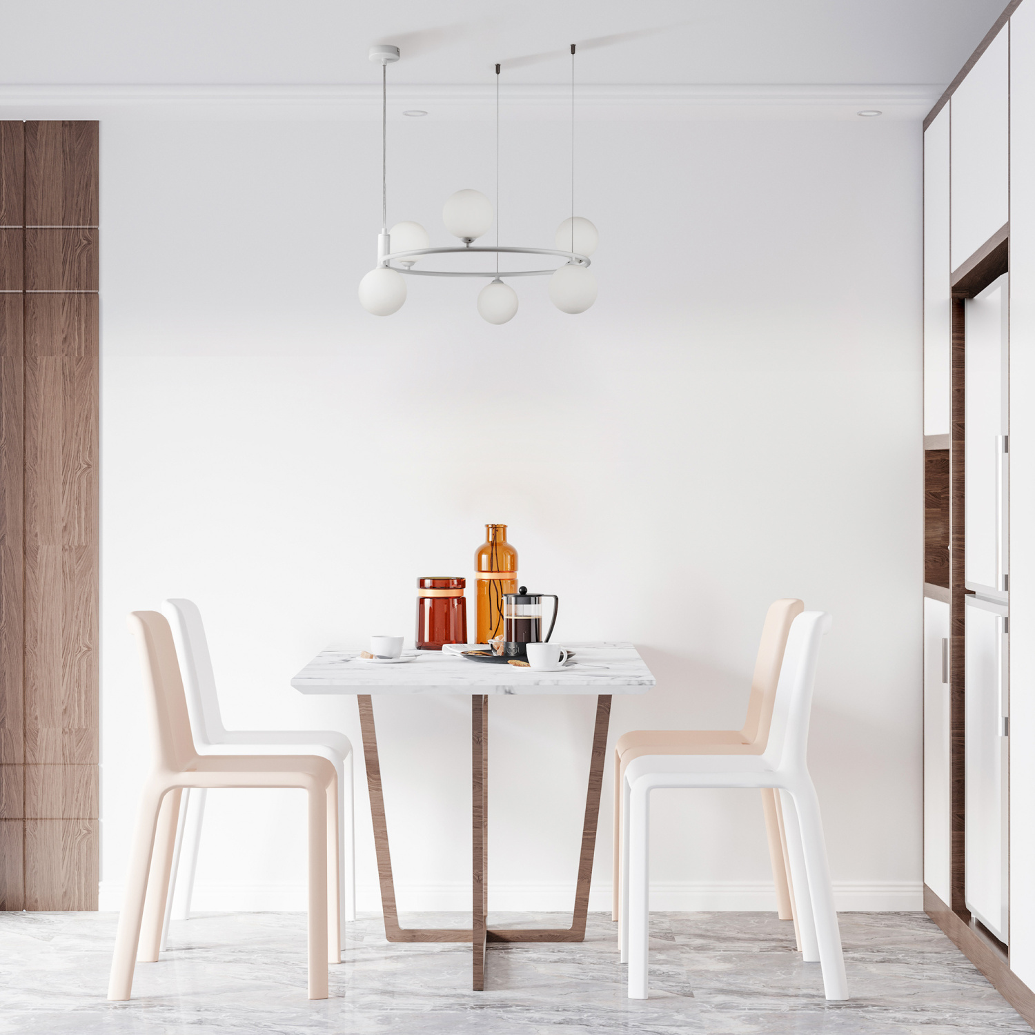 Арматура из металла в трех оттенках: белый, черный, латунь. Плафоны-сферы закреплены на округлом металлическом каркасе. Материал плафонов — выдувное стекло, цвет — белый. Высота подвесных моделей регулируется.
