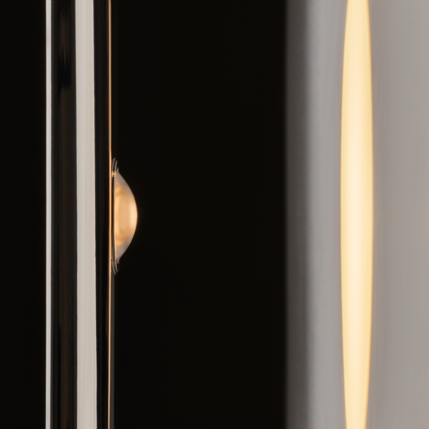 Металлическая арматура, цвета: черный, хром, золото. Источник света: LED-светодиод. Световая температура 3000К. Свет переотраженный, угол рассеивания 100 градусов. Дизайнерское решение с использованием линзы, создающей акцентный круг на стене и эффекта переотражения. Поверхность арматуры глянцевая, полузеркальная. Бра подойдет для зонирования помещений.