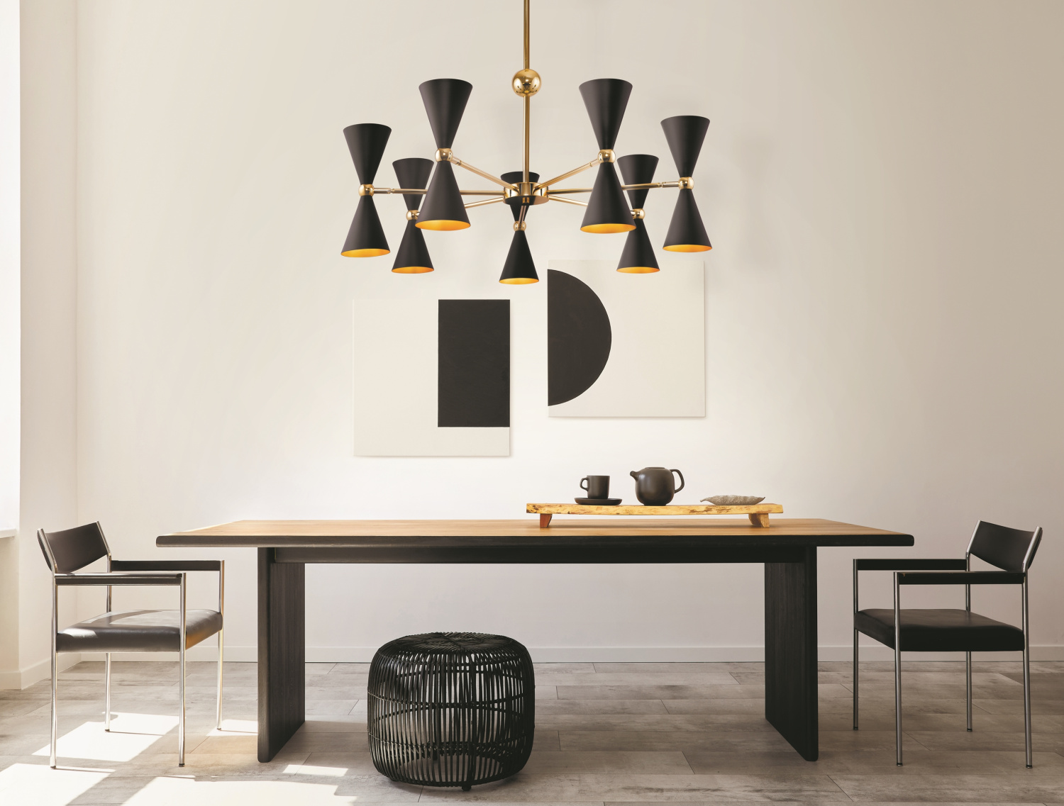 Материал арматуры - металл, оттенок – золото. Металлические плафоны изнутри окрашены в золотой цвет. Внешняя сторона в двух вариантах оттенков: черный и белый. Поворотный механизм, рожки вращаются.