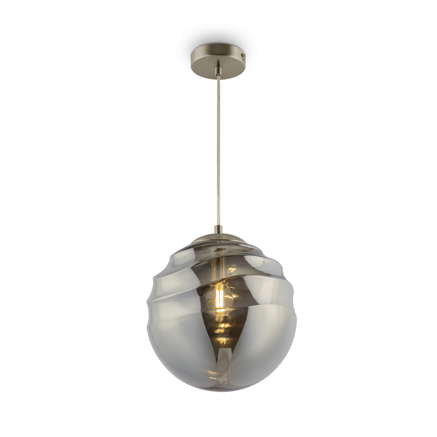 Арматура из металла в двух оттенках: латунь и никель. Декоративный плафон оригинальной рельефной формы. Материал плафона – тонированное стекло, оттенки – дымчатый и янтарный. Регулируемая высота.