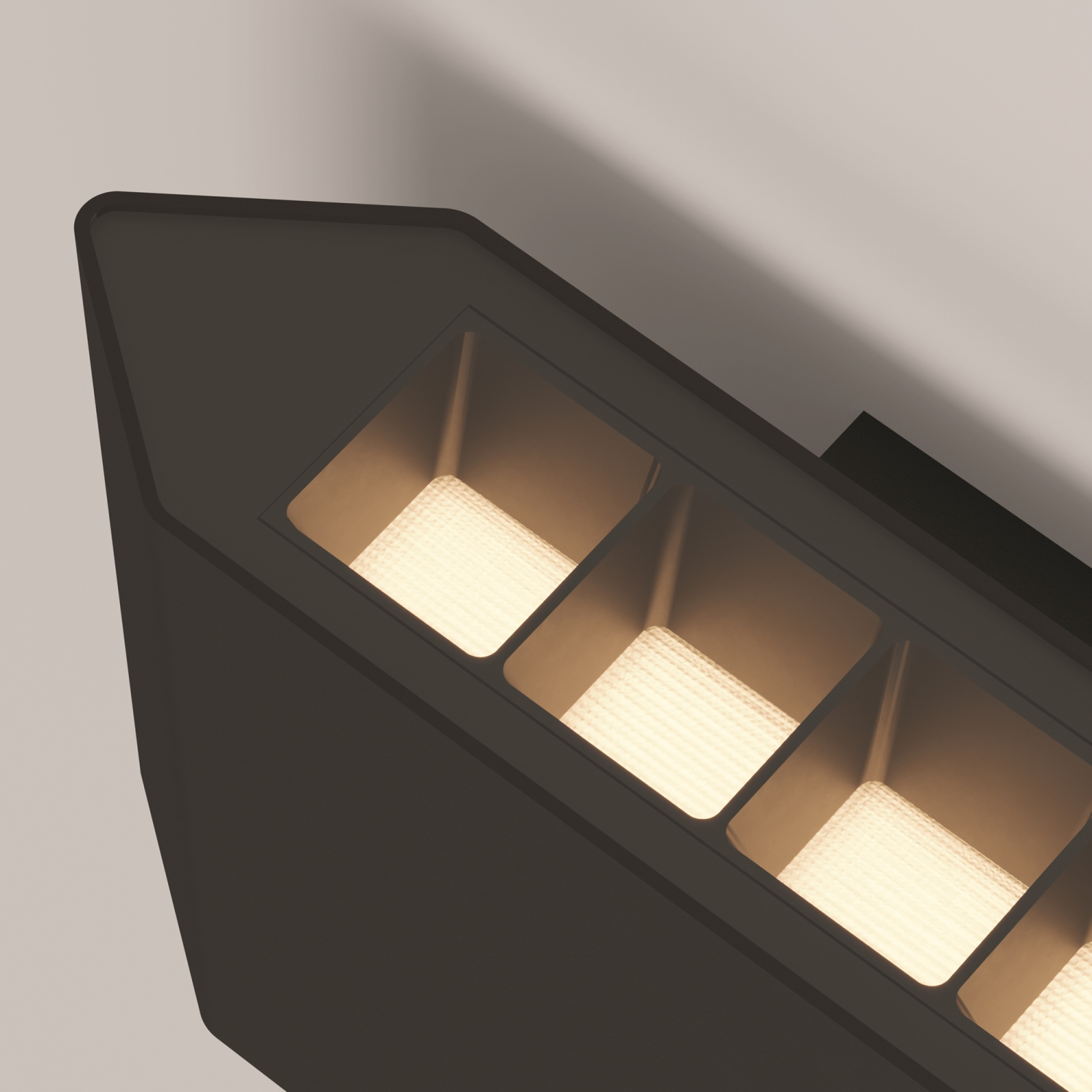 Материал корпуса - алюминий, цвет - графит. Оригинальная графичная форма ромба. LED-источник света, цветовая температура 3000К. Настраиваемый световой поток вверх и/или вниз. Архитектурная декоративная подсветка. Степень защиты - IP54.