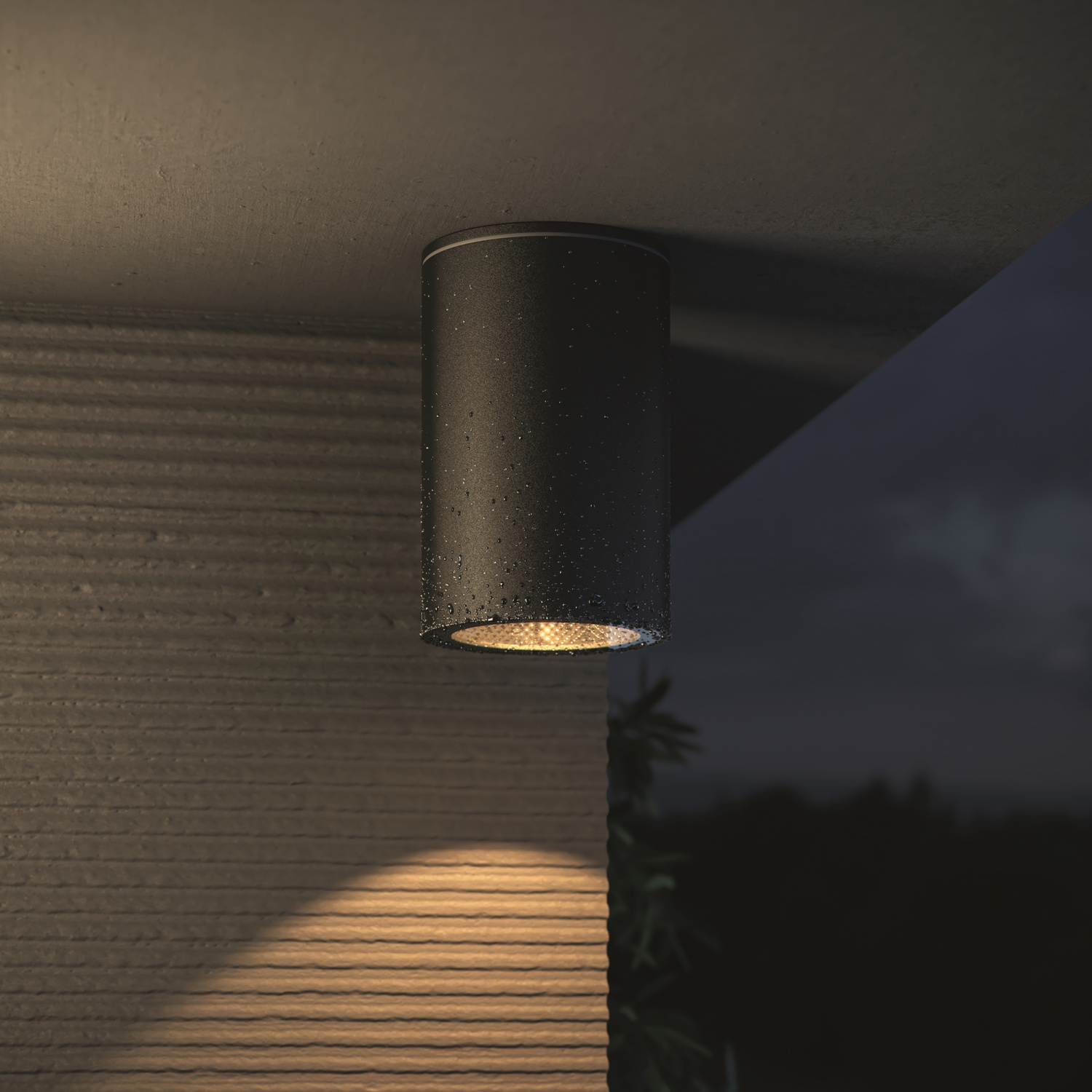 Компактный потолочный светильник. Материал корпуса — алюминий, цвет — черный. Высокий класс защиты IP 54. Корпус устойчив к коррозии и перепадам температур. Источник света — лампа с цоколем GU10.