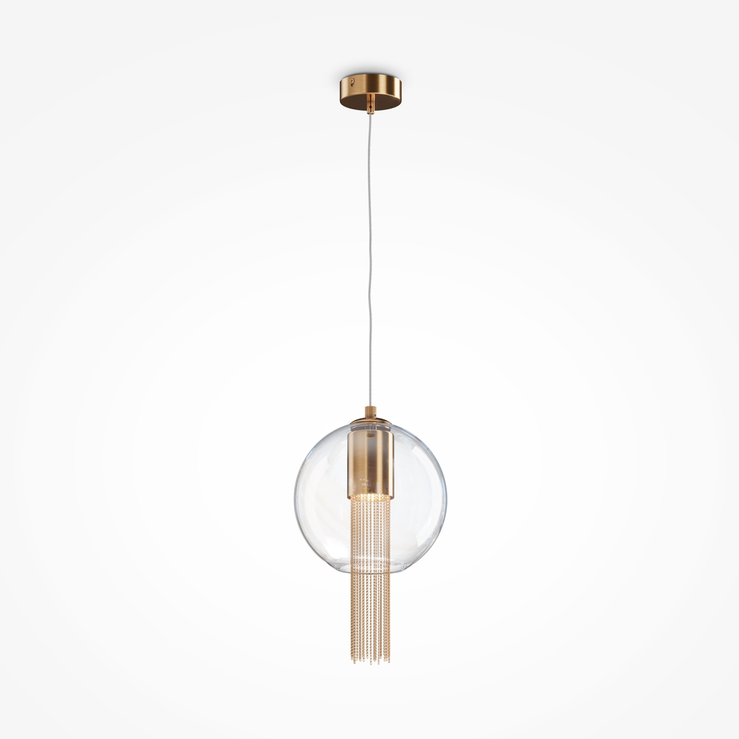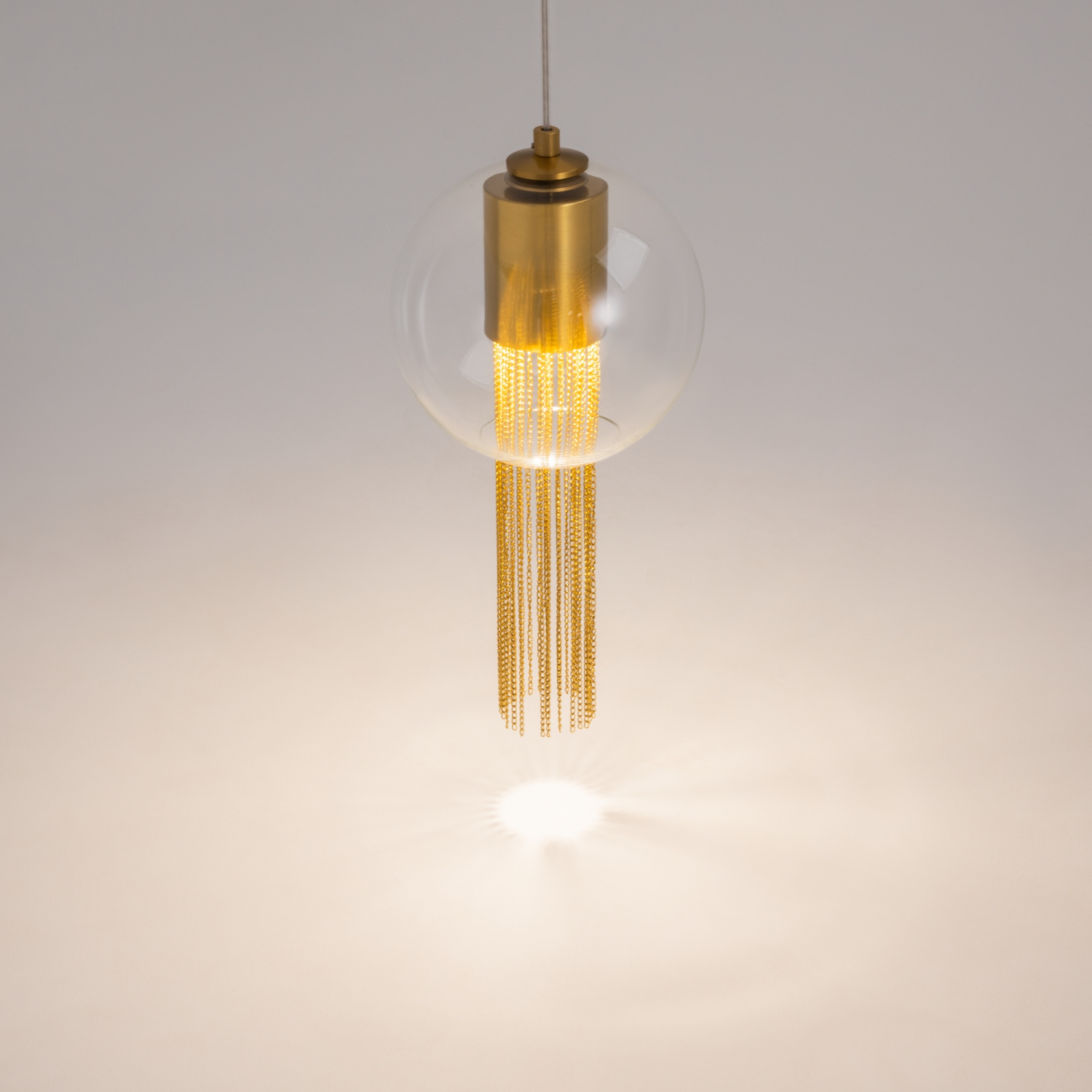 Металлическая арматура в бронзовом оттенке. Плафон-сфера – прозрачное выдувное стекло. Декор – подвесные цепочки внутри плафона. Скрытый источник света.