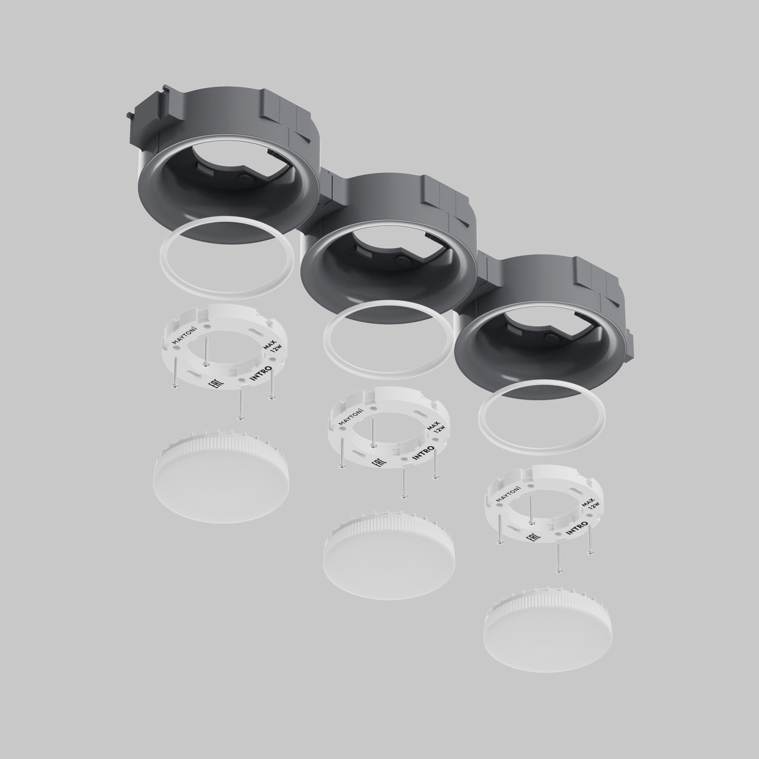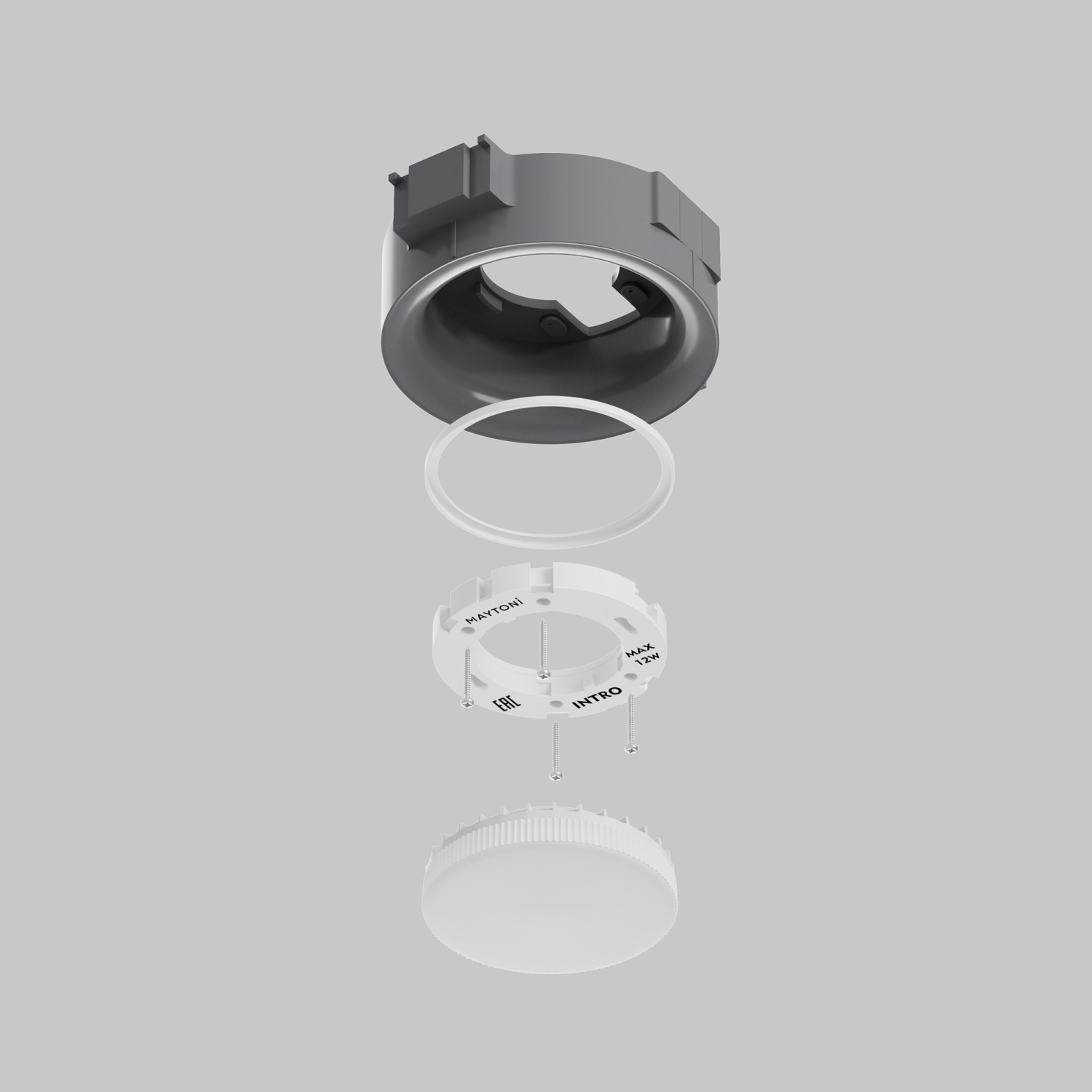 Предназначен для установки в натяжной ПВХ потолок. Состоит из основания, термокольца и цоколя GX53. Основание и цоколь выполнены из термостойкого и ударопрочного АВС пластика. Монтаж производится методом втяжки. Конструкция светильника позволяет легко стыковать между собой несколько оснований, благодаря чему можно создавать комбинации из нескольких светильников.