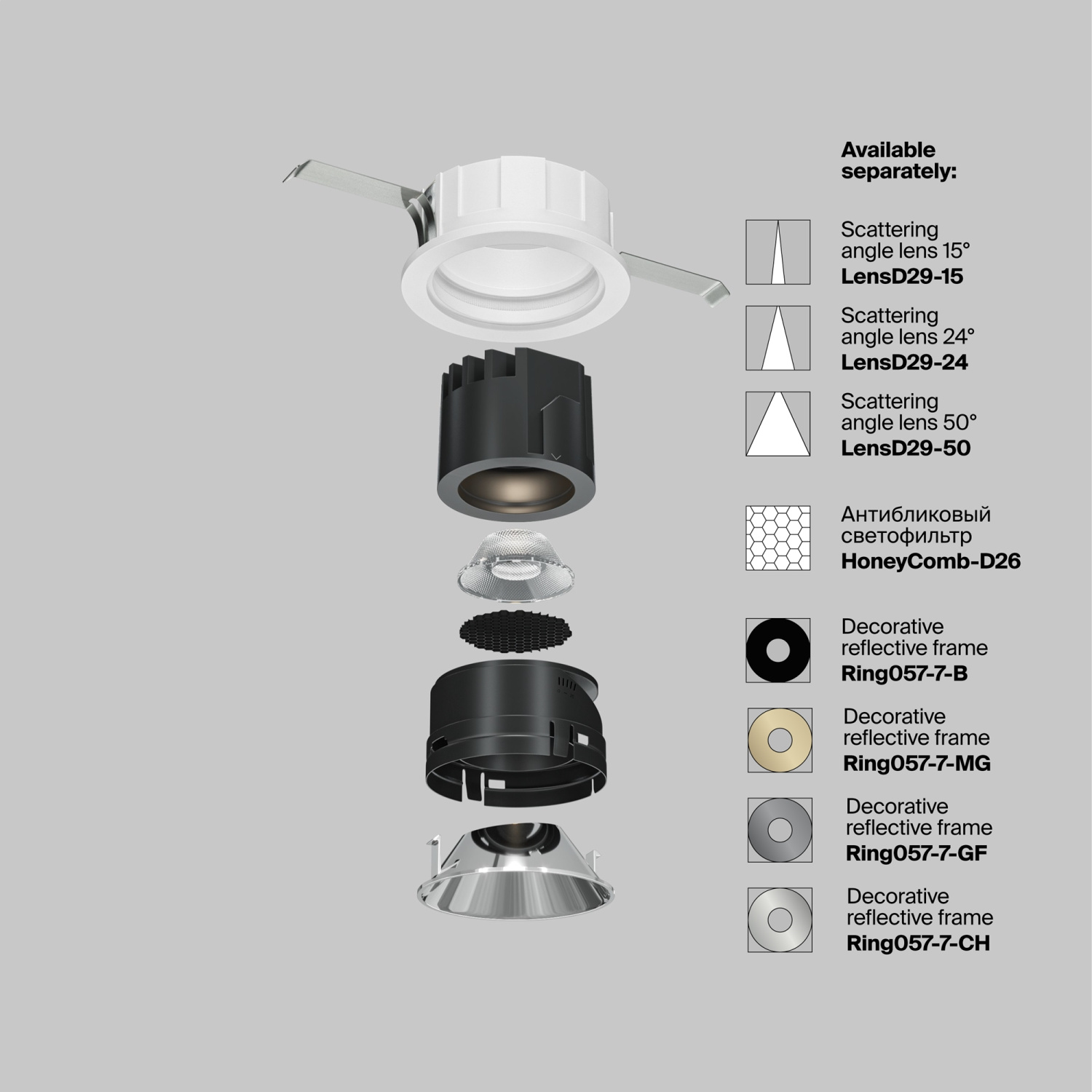 Встроенный утопленный источник света LED, обеспечивает мягкое рассеивание света. Поворотный механизм, позволит организовать акцентную подсветку зон и предметов интерьера. Сменные линзы и фильтры позволят изменить стандартный угол 36° на выбор от 15°-50° и сделать освещение более комфортным. Сменные рефлекторы в ассортименте, позволят подобрать цветовую гамму для большинства трендовых интерьеров.